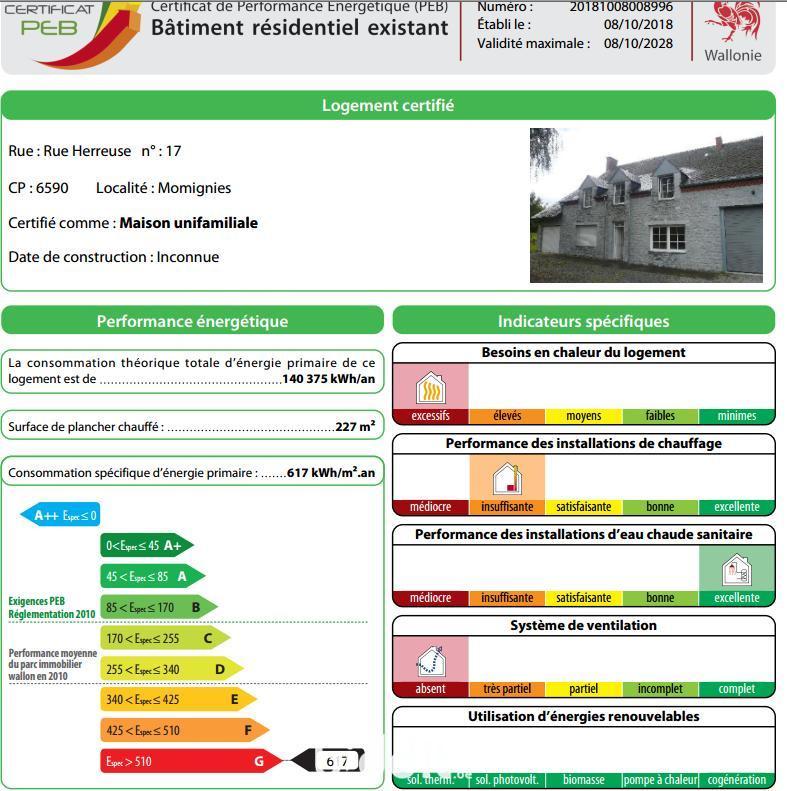 PEB : G – code 20181008008996. Radiateurs/convecteurs avec vannes thermostatiques. Chaudière Eco 34 kW granulés (2021) installée dans le garage – non comprise dans la vente ; possibilité de reprise de créance en attente de confirmation. Chauffe-eau instantané au gaz. Installation électrique non conforme.