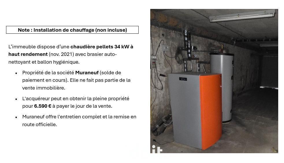PEB : G – code 20181008008996. Radiateurs/convecteurs avec vannes thermostatiques. Chaudière Eco 34 kW granulés (2021) installée dans le garage – non comprise dans la vente ; possibilité de reprise de créance moyennant paiement de 6590 €. Chauffe-eau instantané au gaz. Installation électrique non conforme.