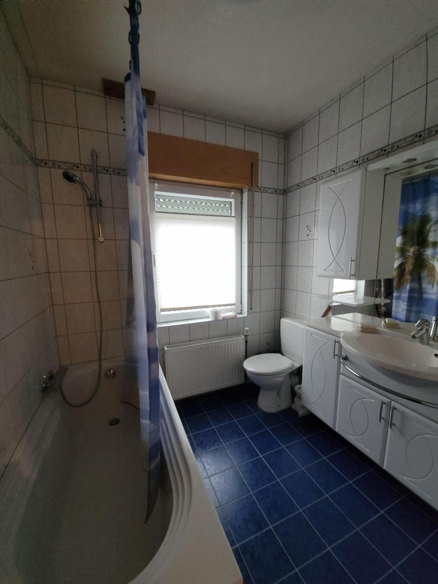 1er étage : 3 chambres à coucher, salle de bains (baignoire-douche, wc, meuble évier) carrelée au sol et au mur ;