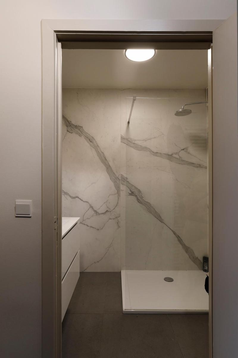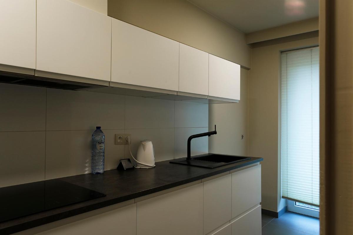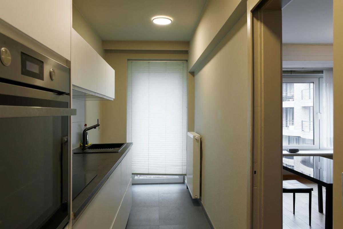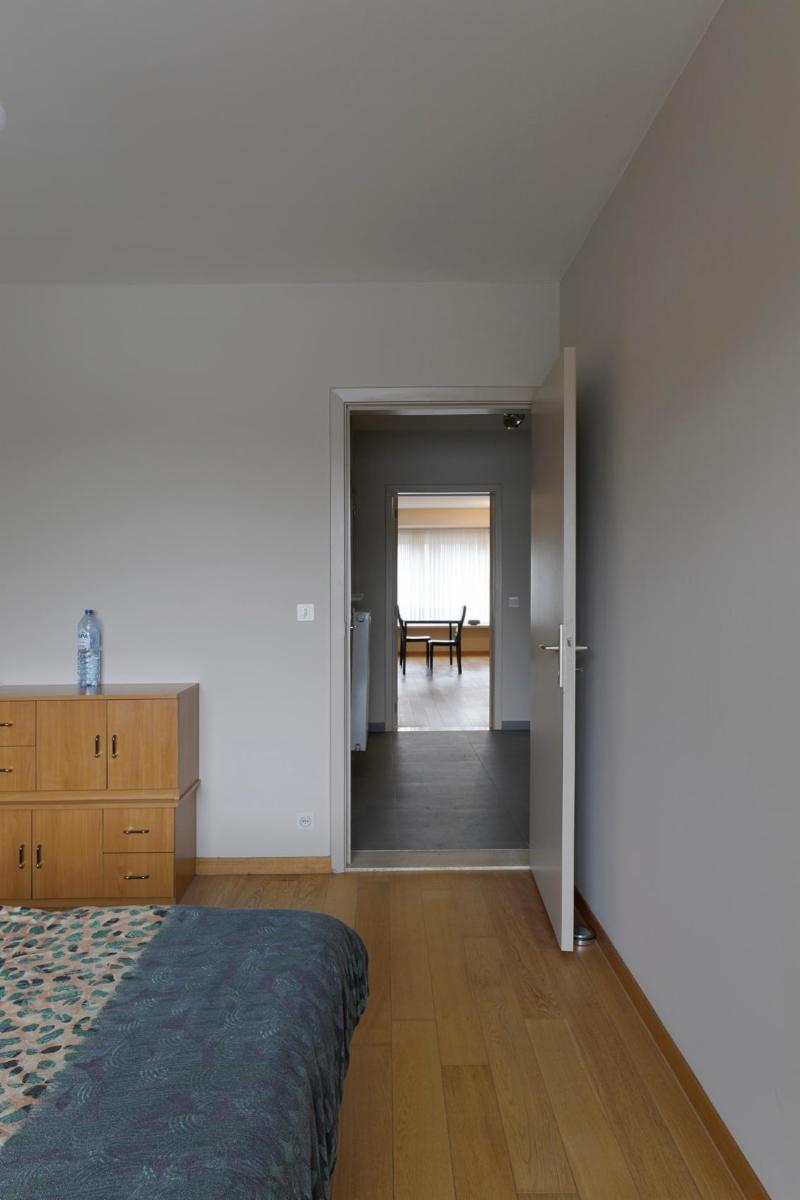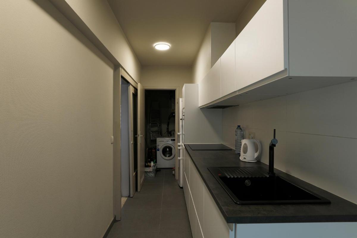 Situé dans le centre de Roulers, cet appartement spacieux et lumineux se compose d'un hall d'entrée avec un sol neuf, d'un grand salon rectangulaire en parquet dont la fenêtre donne sur le parc situé de l'autre côté de la rue, avec une cheminée encastrée et une porte coulissante donnant accès à la cuisine blanche entièrement rénovée. Cette cuisine, dotée d'un sol neuf, comprend un four encastré, un micro-ondes, une plaque de cuisson électrique, un évier et un grand réfrigérateur-congélateur indépendant, ainsi qu'une petite terrasse. À côté de la cuisine se trouve un débarras séparé abritant la chaudière à gaz rénovée. Il y a une salle de bains entièrement rénovée avec douche à l'italienne, un lavabo avec meuble et miroir, et depuis le hall d'entrée, on accède également à des toilettes séparées. Cet appartement dispose de deux grandes chambres avec parquet, dont les fenêtres donnent sur l'arrière de l'appartement. La chambre de droite donne accès à la terrasse qui s'étend sur toute la longueur des deux chambres. Les compteurs se trouvent au sous-sol, où se trouve également un débarras pour l'appartement. À l'arrière de l'immeuble se trouve le garage avec porte électrique.