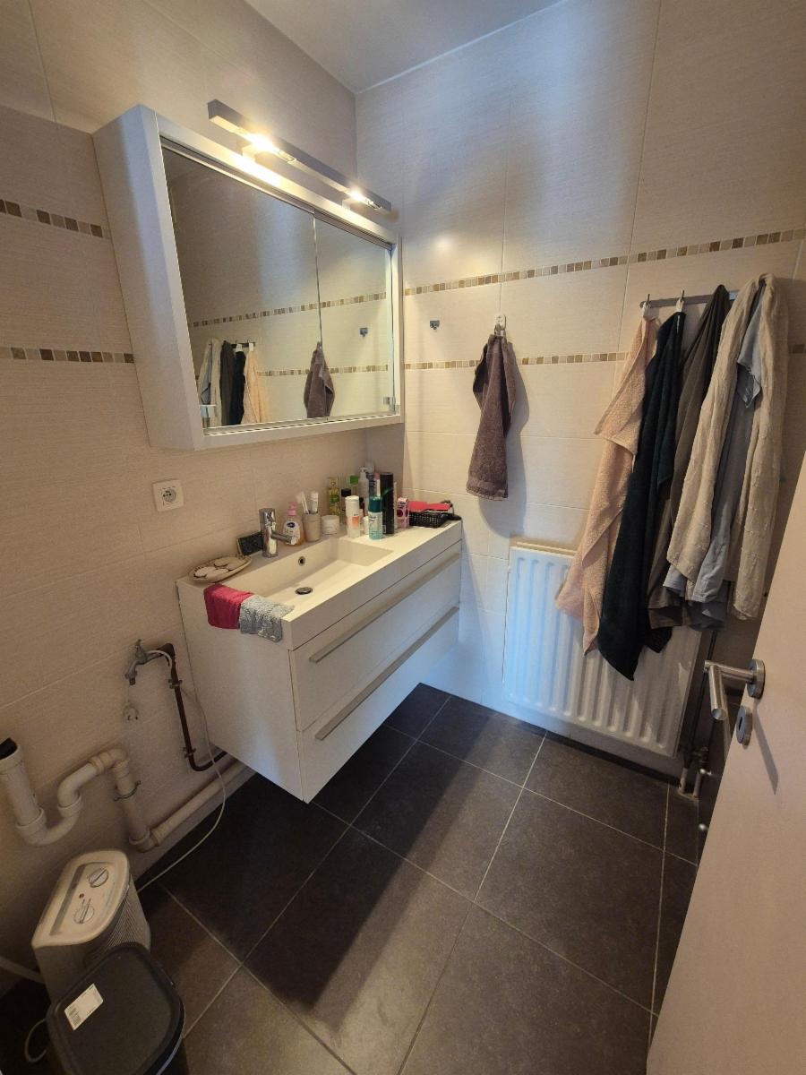 hall d'entrée (8,5 m²), living et salle à manger (23 m²) avec terrasse sur esplanade (porte coulissante) (5 m²), WC séparé, salle de douche (2 m²) (évier, douche avec siège), chambre avec rangement (10 m²), grande chambre avec balcon (13 m²), cuisine équipée de 2 éviers, plaques à induction, hotte et un frigo (8,5 m²)