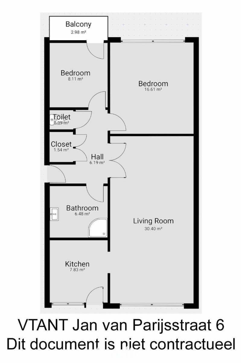L’appartement se compose de: un hall d’entrée avec vestiaire, un spacieux séjour, une cuisine (équipée), un W.C., une salle de bain et 2 chambres, dont une avec terrasse.