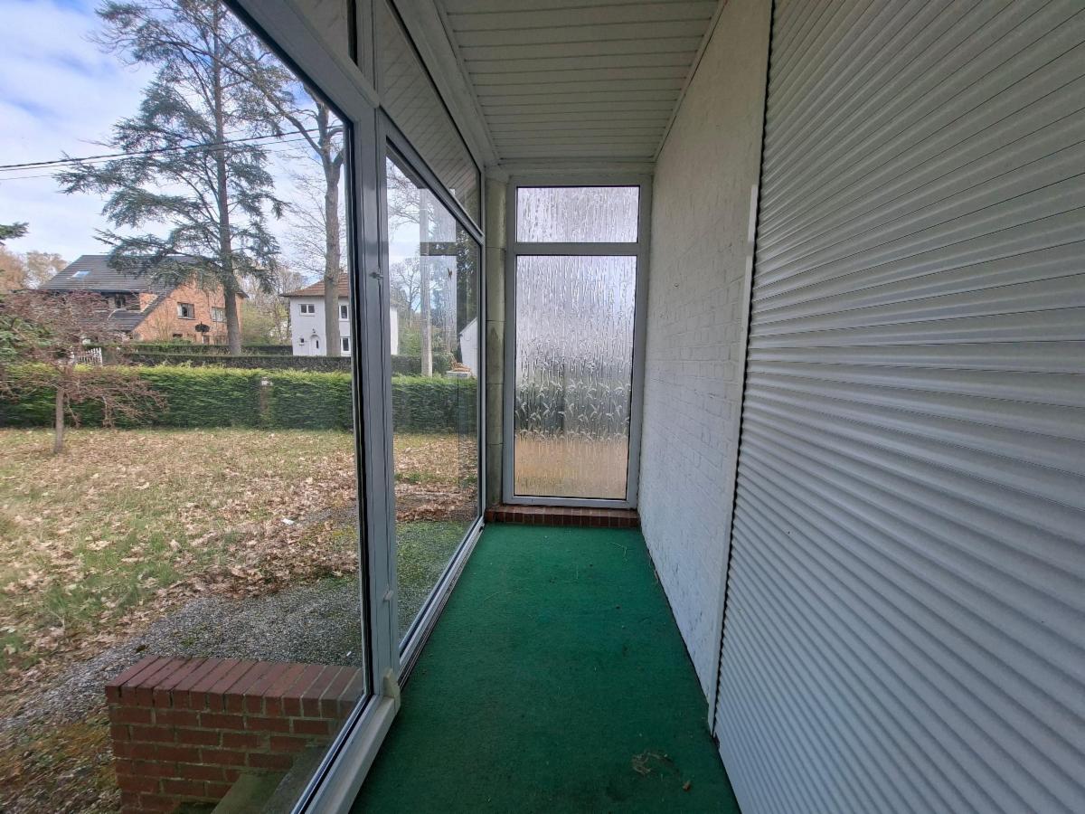 RDC : Hall d'entrée, cuisine, salon et salle à manger, petite pièce vitrée côté jardin à l'arrière du living, salle de bain avec baignoire, évier et