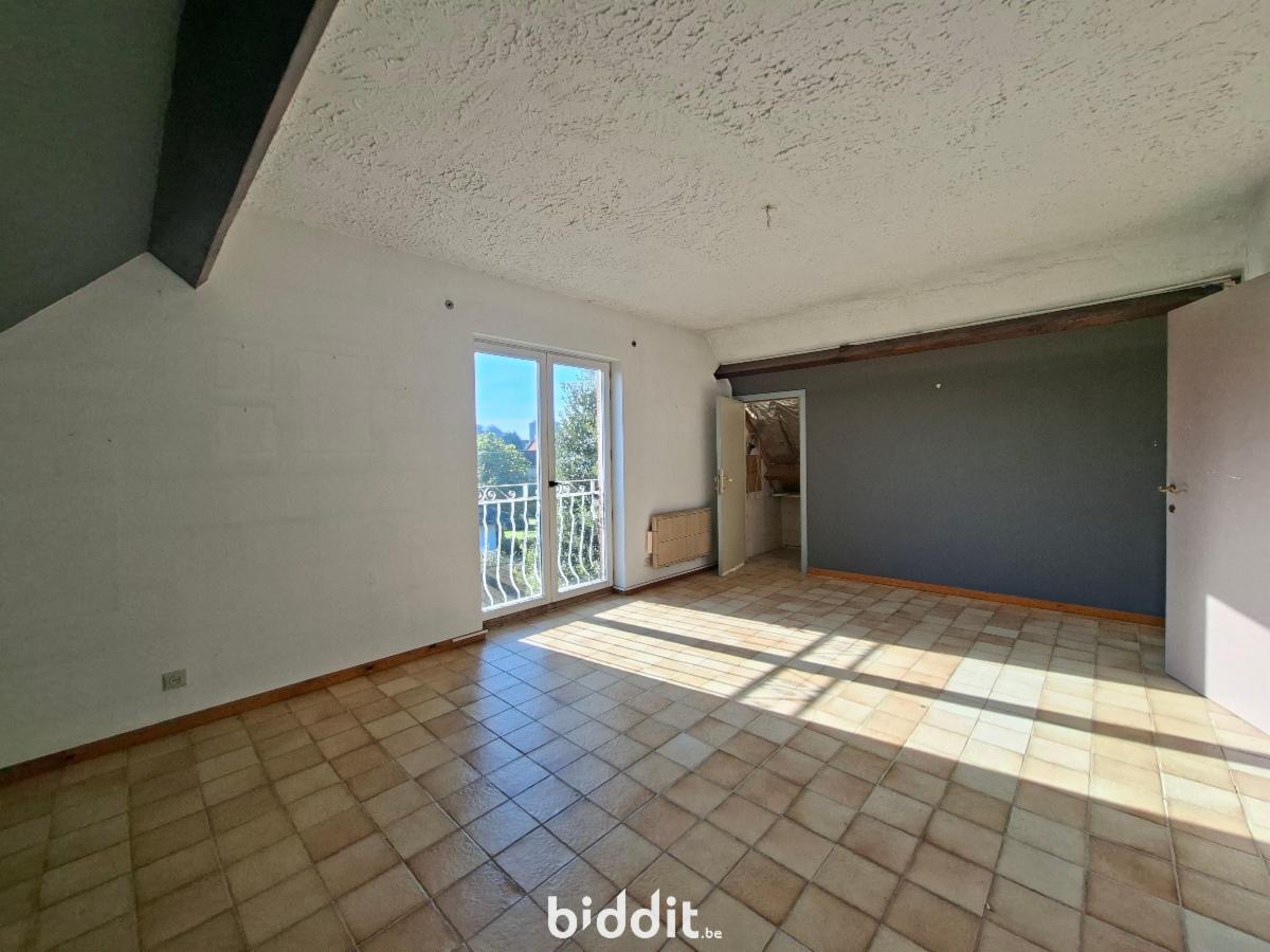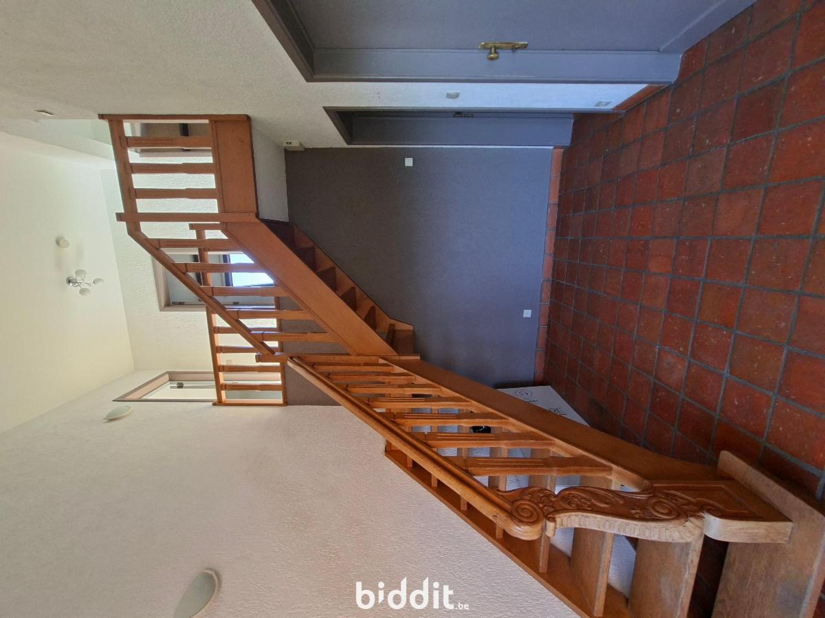 - au rez: d'un spacieux hall d'entrée donnant sur l'étage avec un bel escalier en chêne clair, beau séjour en "L", cuisine semi-équipée (taque électrique-hotte-four-frigo), WC avec lavabo, garage 1 voiture.
