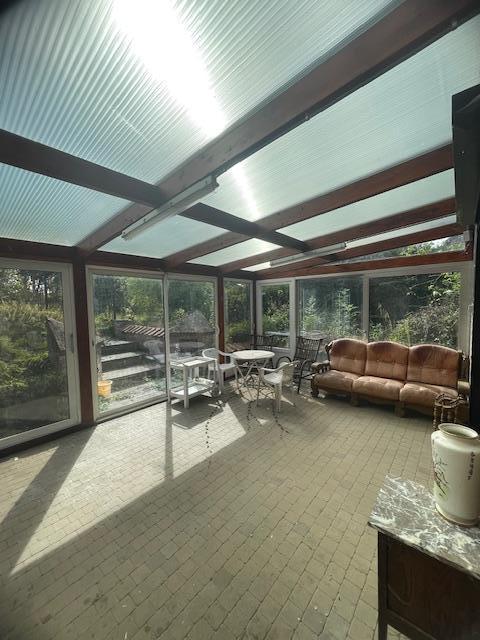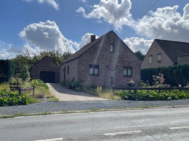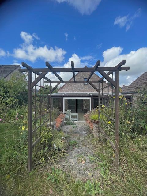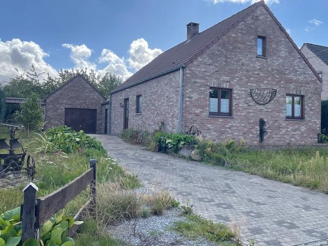 Belle villa de plain-pied comprenant corridor, living, cuisine équipée, salle de bains équipée, wc avec lave-mains, véranda, buanderie, deux chambres, jardin avec atelier, pergola, châlet et passage latéral.