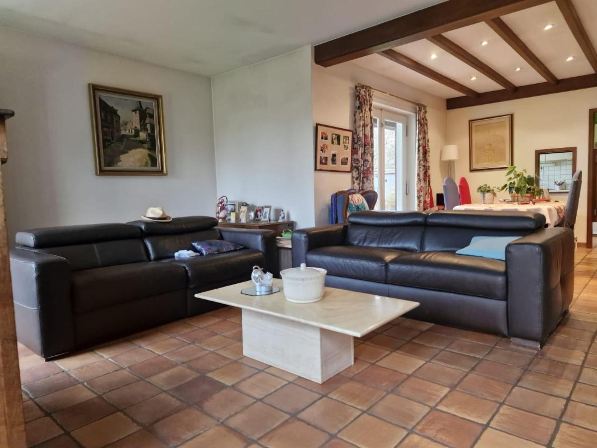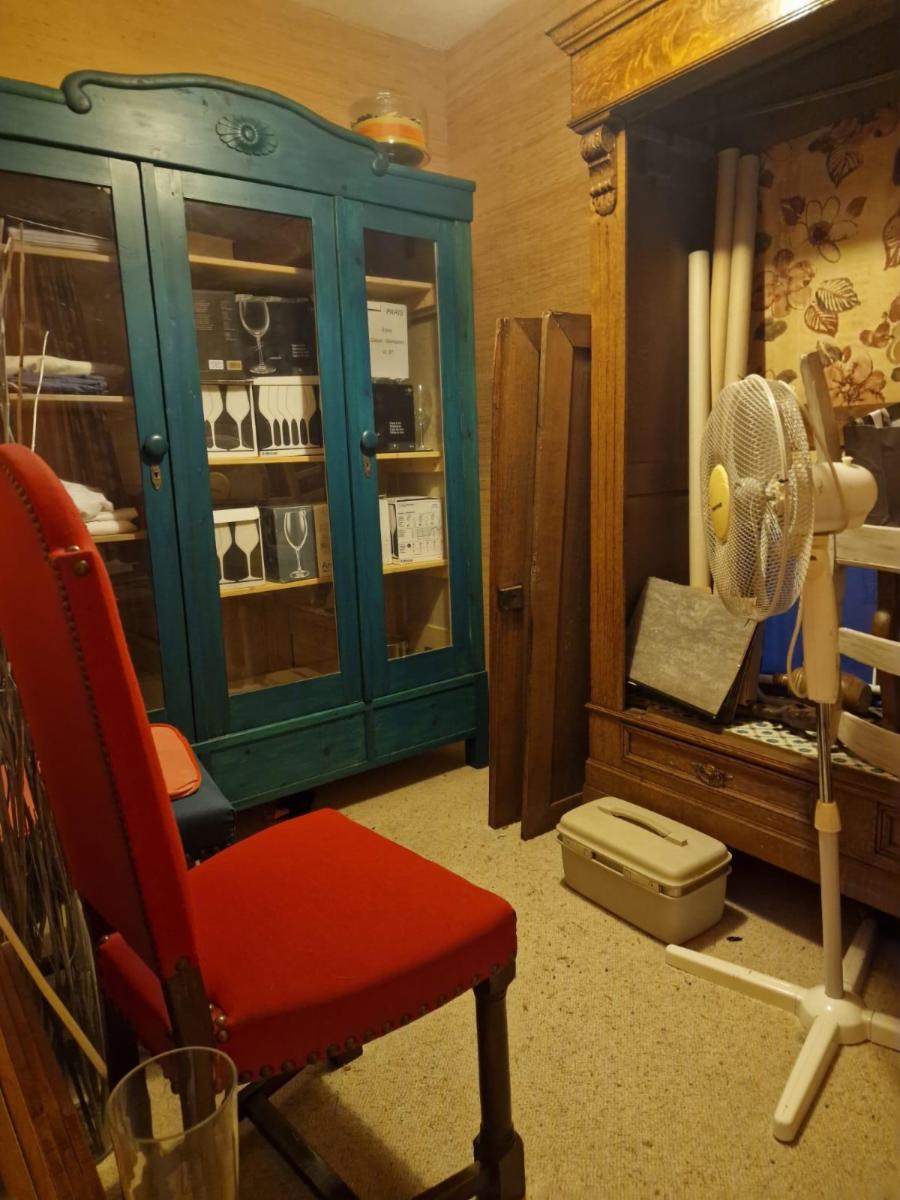 Salon avec poêle à pellets, salle à manger, cuisine, deux débarras, deux chambre à coucher (éventuellement 3), une salle de bains avec WC, un WC indépendant, un bureau ( ou 3ème chambre) et une pièce de rangement.