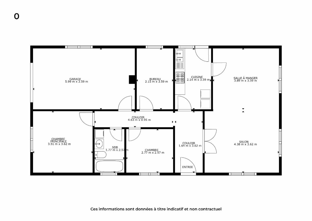 hall d'entrée, un séjour-salle à manger, une cuisine, un hall de nuit, une salle de bains (WC-évier-baignoire), un petit bureau, deux chambres, un garage avec porte électrique