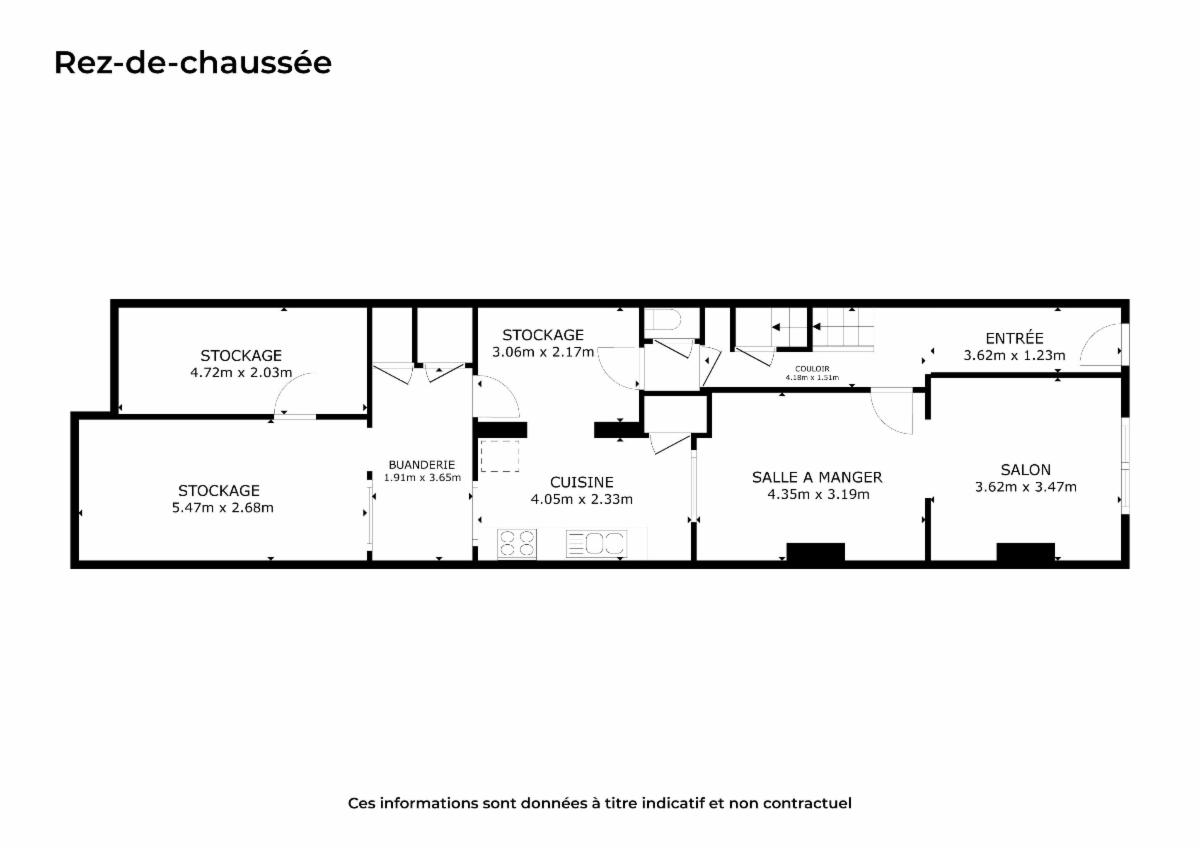 Rez-de-chaussée : hall d'entrée, cuisine, salon, salle à manger, WC, buanderie, espace de stockage et jardin.