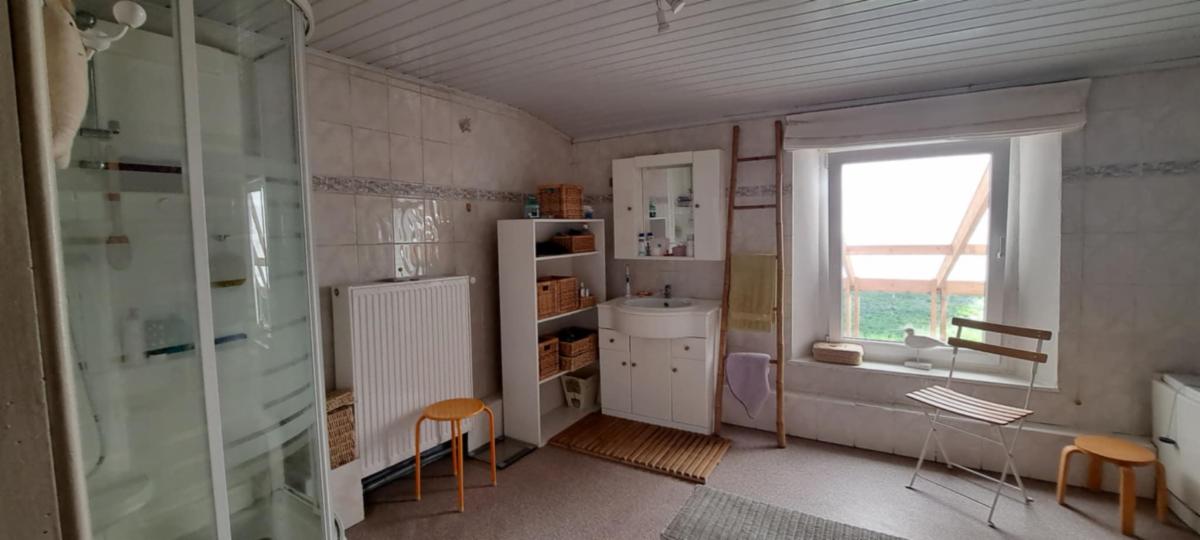 Commodités : DV en pvc, CC mazout, caves, 2 greniers de rangement, jardin, chalet, garage avec porte électrique. Surface habitable de 200 m².