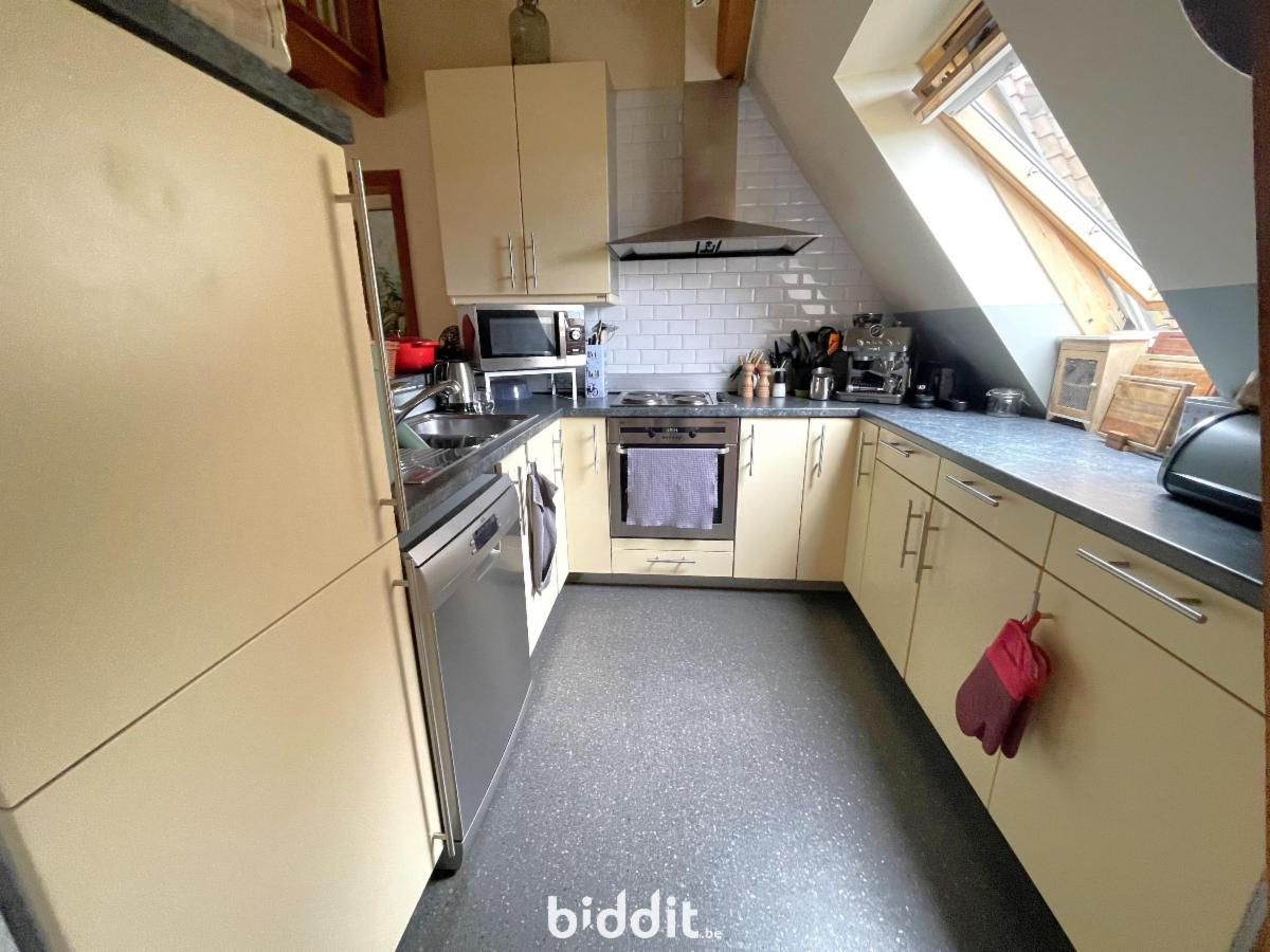 Le logement (42 A), se compose d'une grande pièce de vie avec cuisine équipée et foyer, une chambre mansardée avec parquet, une salle de bains avec WC et une mezzanine. PEB E