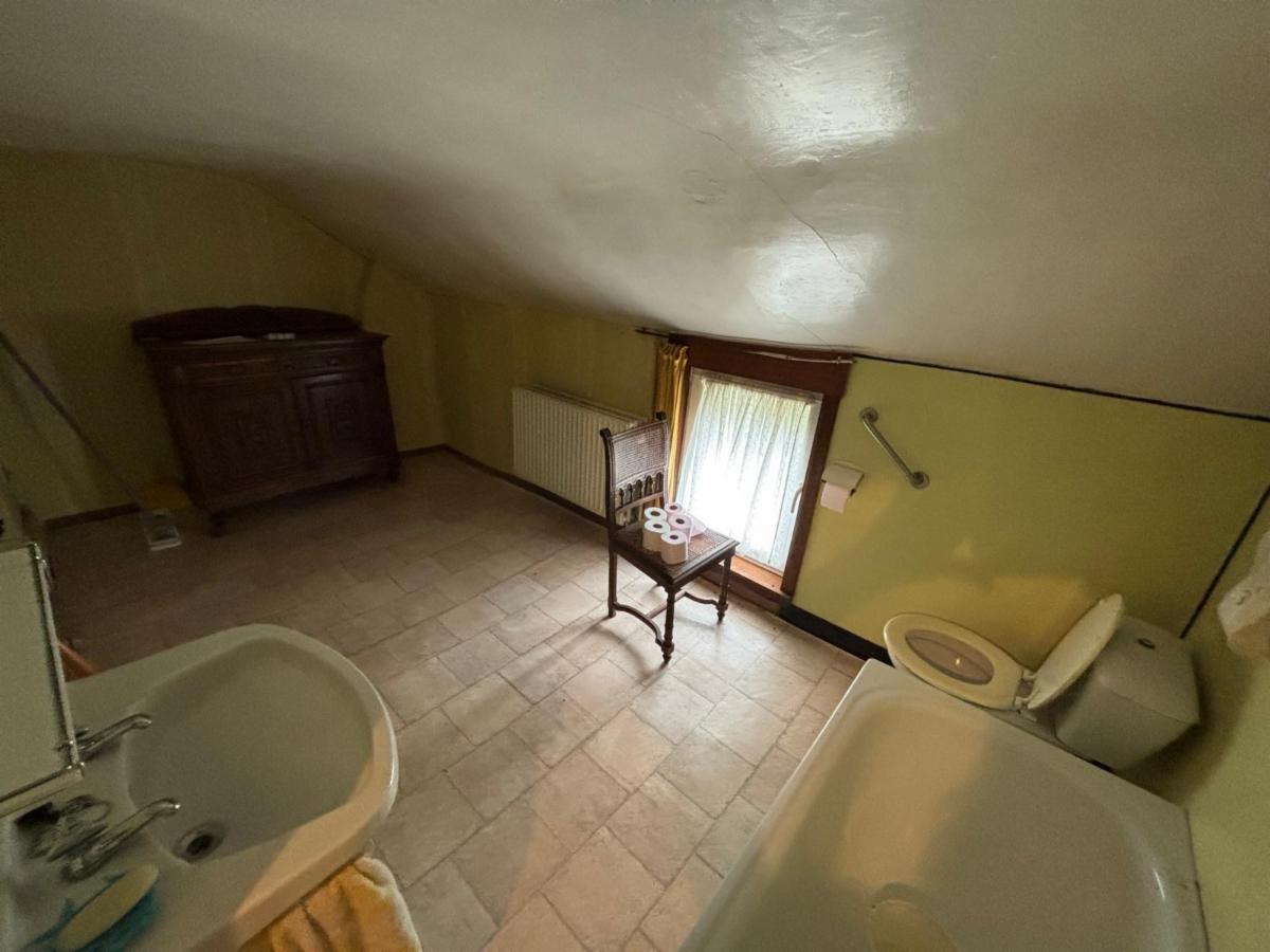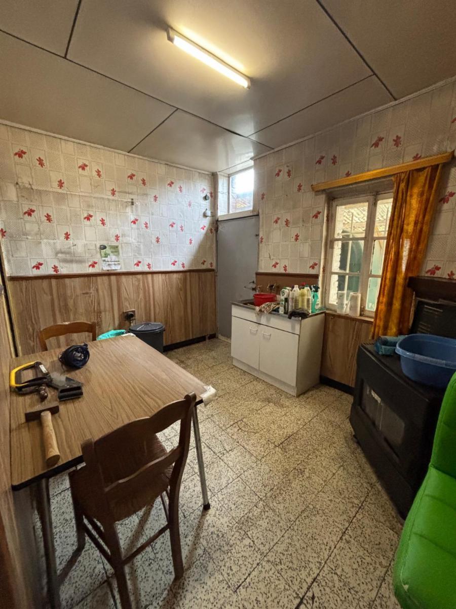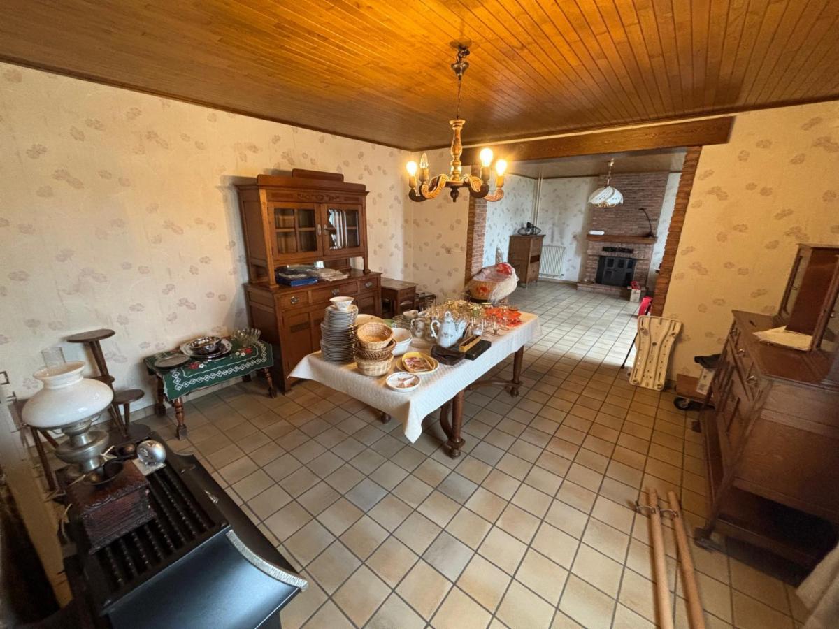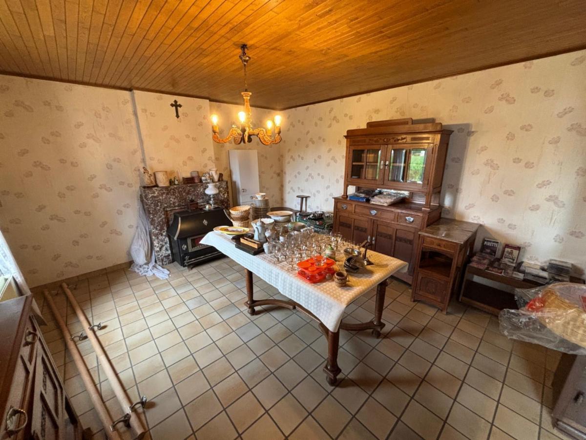 - Rez-de-chaussée : Entrée sur une pièce de vie à l’avant spacieuse (salon et salle à manger) avec cheminée à insert au bois + poêle dans la partie salle à manger non fonctionnel, une cuisine à l’arrière ;