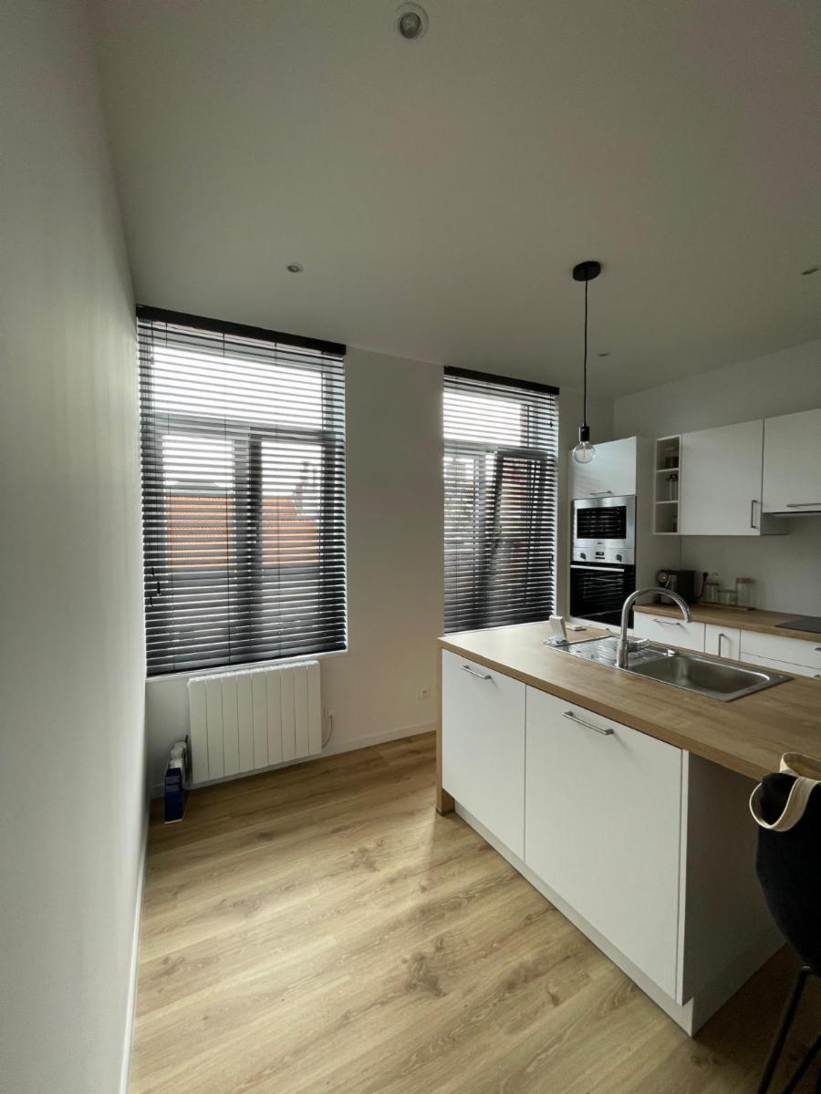 L'appartement se situe aux deuxième et troisième étage (mansardé). Il dispose d'une cuisine équipée avec un four, un micro-ondes, un frigo et un congélateur encastrés, de même qu'une taque de cuisson à induction. L'espace cuisine est ouvert et donne sur le salon.