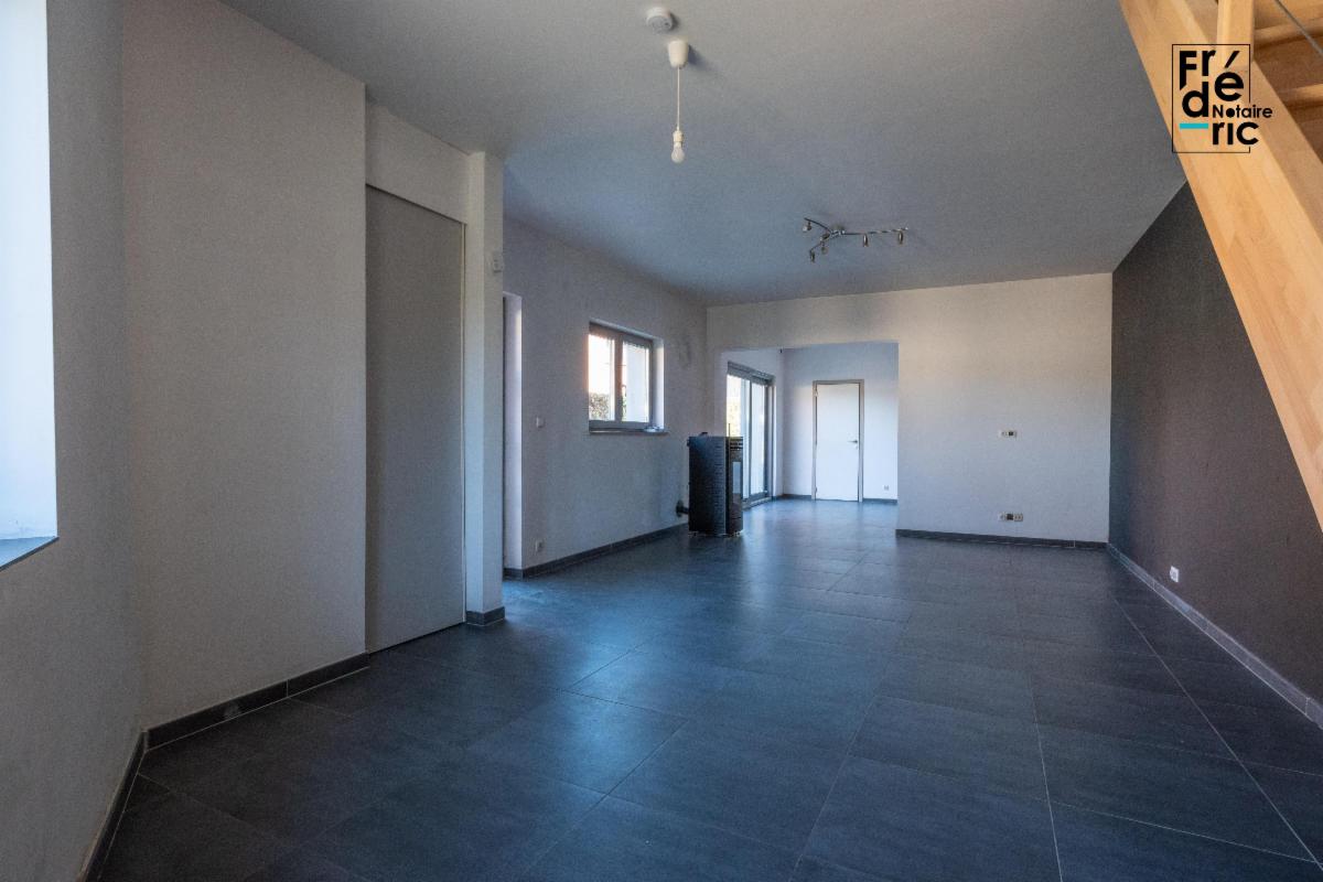 Maison 2 chambres avec terrasse et jardin située dans une rue calme de Ghlin. La maison est accessible via une porte ou un large portail permettant de garer un ou plusieurs véhicules sur la terrasse. Au rez-de-chaussée, l'espace est majoritairement occupé par une pièce de vie comprenant une cuisine et un living. Cette pièce de vie fait près de 50m². Une arrière-cuisine avec toilette et alimentations/évacuations pour machines à laver et sèche-linge complète ce niveau. Au premier étage, le couloir dessert une salle de douche carrelée (7m²) et deux chambres de 12 et 16 m². L'électricité est conforme et le bien est en bon état général.