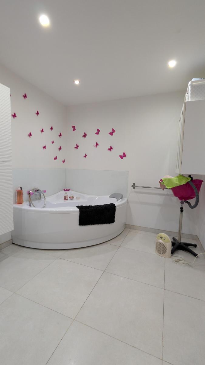 A l’étage, une grande pièce de vie avec cuisine équipée (frigo encastrable + frigo américain, lave-vaisselle, four, taque induction, hotte à charbon), une chambre parentale avec dressing, une deuxième chambre, un WC séparé, une salle-de-bain.