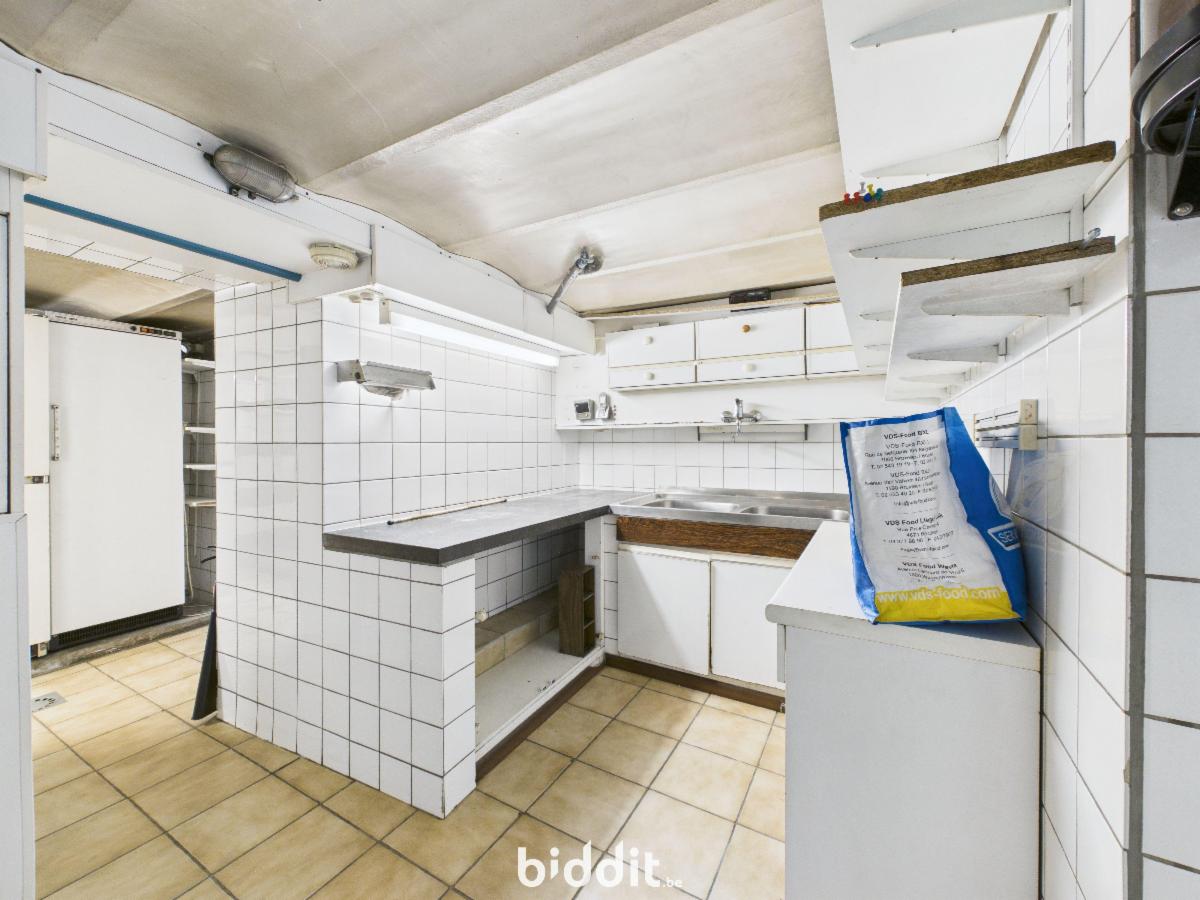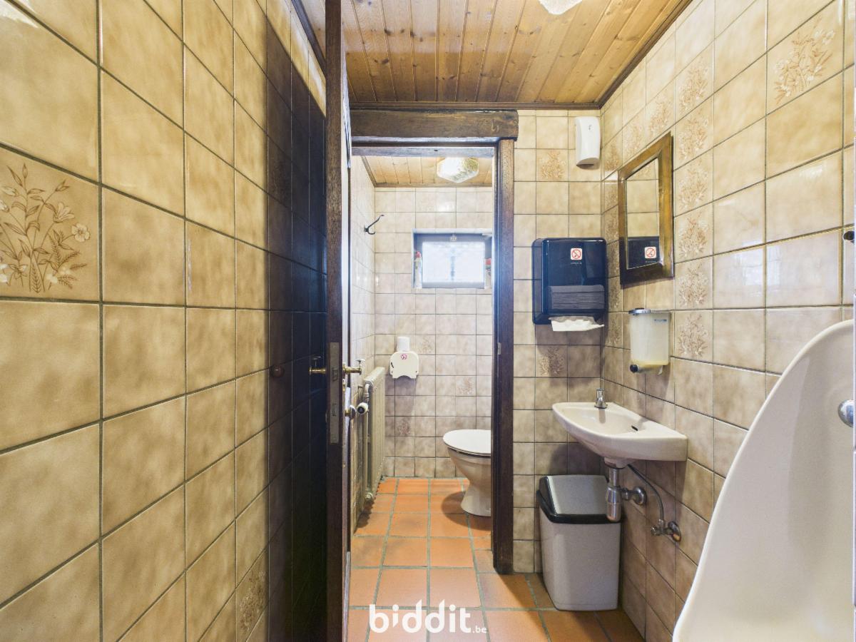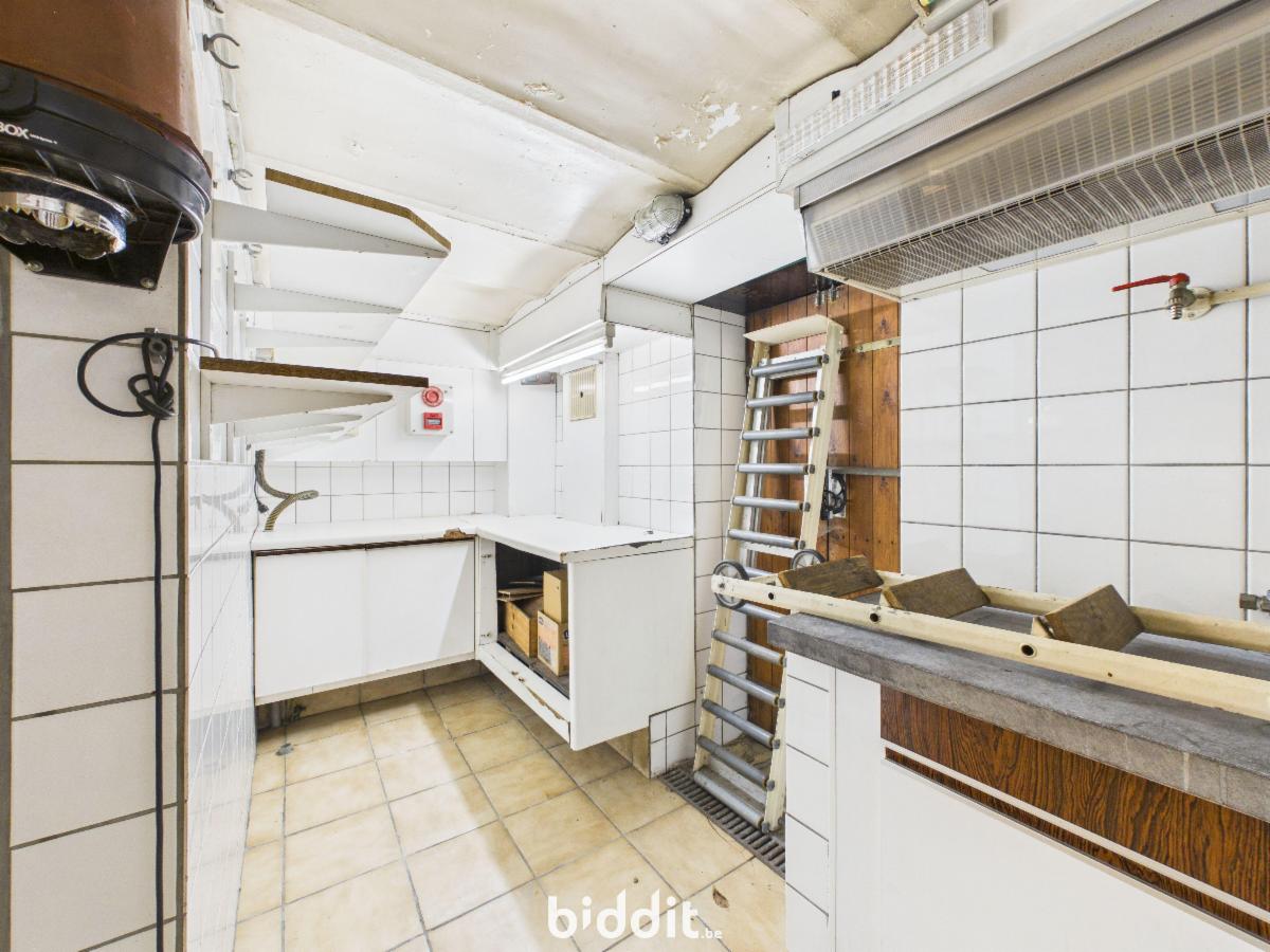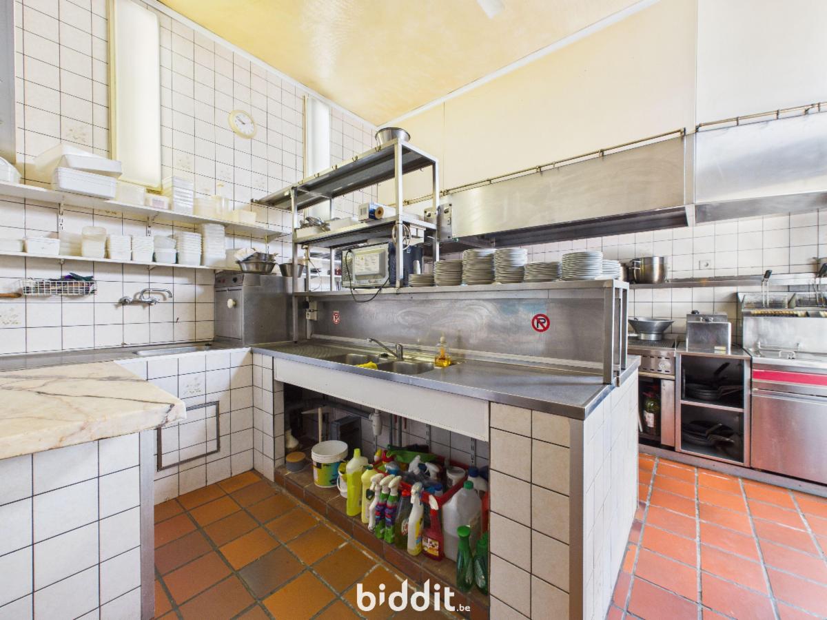 Rez-de-chaussée (128 m²)**: Un sas d’entrée distribuant une surface commerciale à usage de salle de restaurant, d’un bloc sanitaire homme/dame, d’une cuisine professionnelle et un accès à une cour arrière de ± 9 m² avec WC séparé.