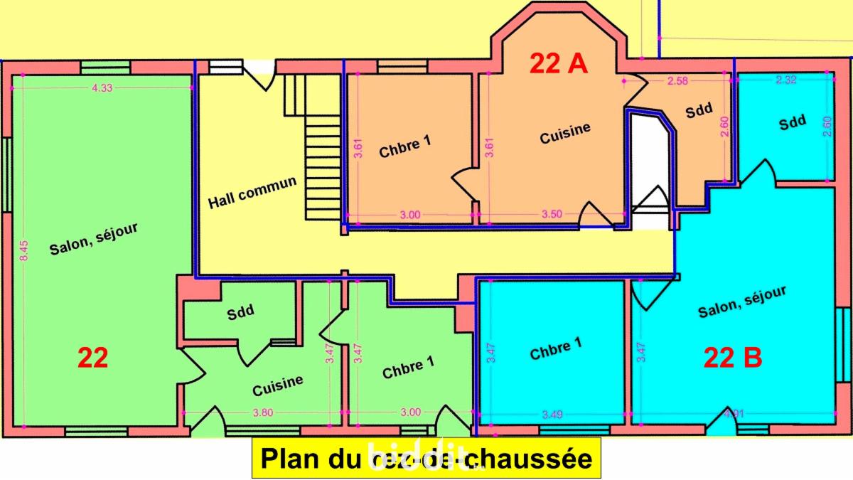 Dans une maison de rapport sis Rue du Fraity numéro 22, sur un terrain, cadastré s section B, numéro 710DP0001 pour une contenance de 12 a71 centiares: 1comprenant : 1/ Appartement 22: rdc 1 chambre, salon, grand séjour-salle à manger, cuisine, salle de douche et WC, terrasse et jardin, 71 m2, loyer de 350€ - 2/Appartement 22A :rdc 1 chambre, cuisine-séjour et salle de douche avec WC, 43 m2, loyer de 500 € 3/ Appartement 22B :rdc 1 chambre, salon, cuisine, salle de bains et WC, terrasse et jardin, 55 m2, loyer de 500 € 4/ Appartement 22C étage 1 chambre, salon, cuisine, salle de bains et WC, 63 m2, loyer de 498 € 5/ Appartement 22D étage 1 chambre, grand séjour-salle à manger, cuisine, bureau, salle de bains et WC, jardin, 81 m2, loyer de 514 € Idéal pour investisseurs ! Revenus locatifs actuels hors charges : 2.432 €/mois -Caractéristiques techniques : Électricité conforme, compteurs électriques séparés - Un compteur d'eau principal et décompteurs pour chaque logement, Châssis principalement PVC double vitrage + bois simple vitrage; Chauffage individuel électrique par accumulation et/ou direct; Eau chaude via boiler électrique; Emplacement pour machine à laver; Toiture en ardoises et zinc en bon état; 1 emplacement de parking par logement