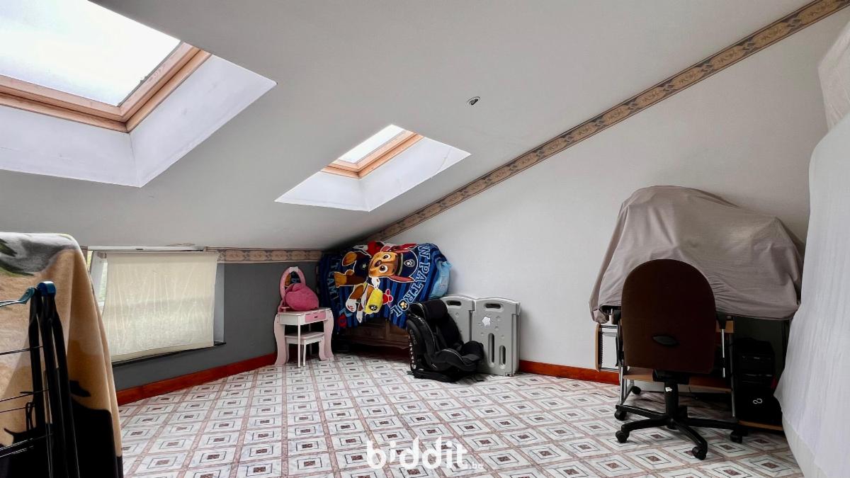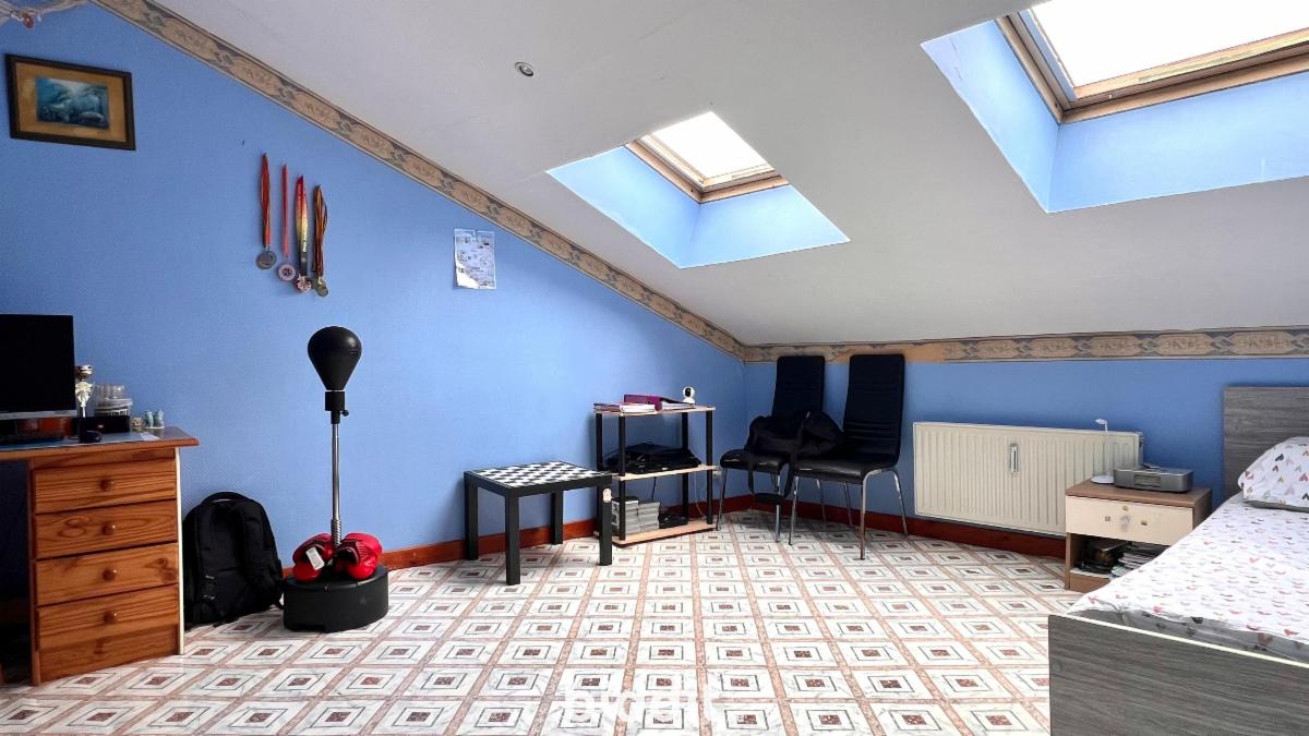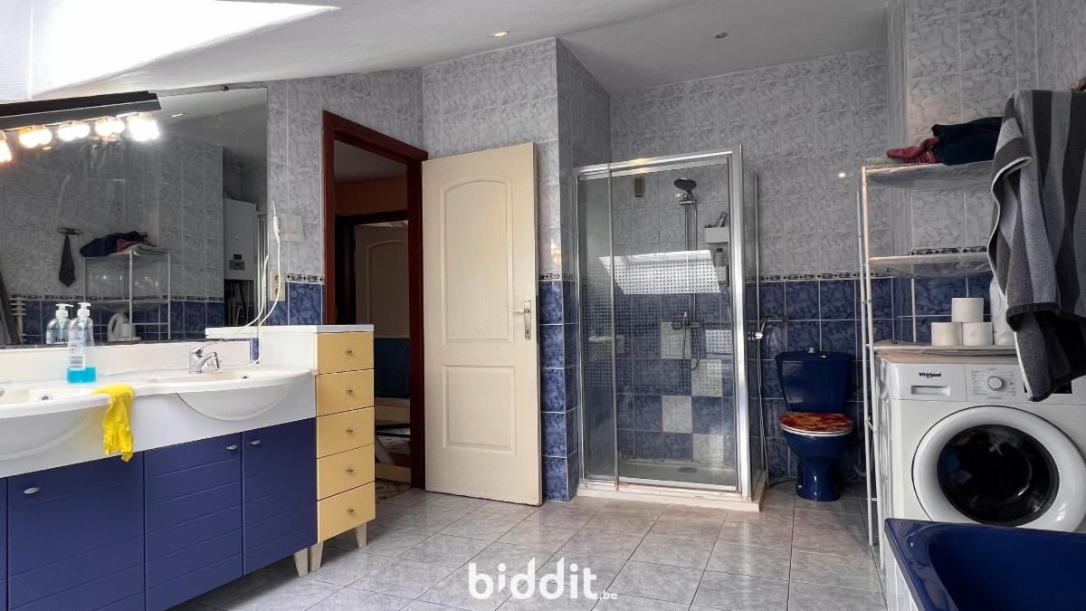 À l’étage, on retrouve trois grandes chambres de ± 18 m², 19 m² et 20 m² ainsi qu’une salle de bain de ± 16 m² équipée d’une douche et d’une baignoire.