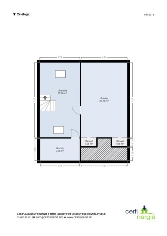 - 2ème étage : Un grenier déjà aménagé et un grand grenier supplémentaire aménageable selon vos besoins (chambre additionnelle, bureau, salle de jeux,...).