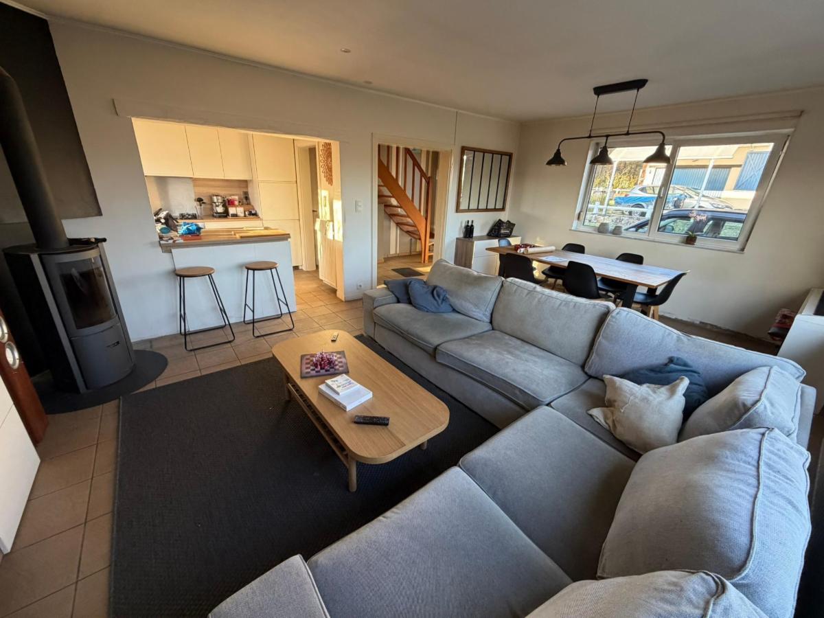 Rez: hall, living lumineux avec poêle à bois, cuisine équipée récente, buanderie, 2 chambres, salle de bains avec baignoire, douche et évier, wc et garage.