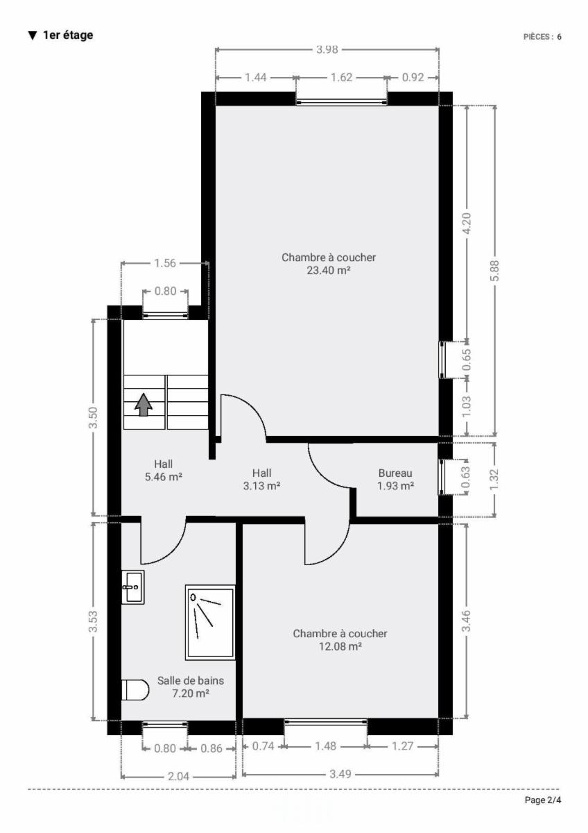 - Au premier étage : hall, petit bureau, deux chambres à coucher et une salle de bains avec douche, évier et WC ;