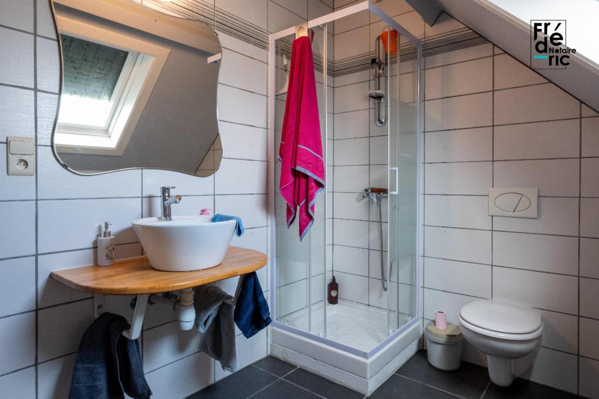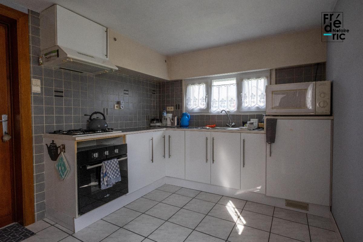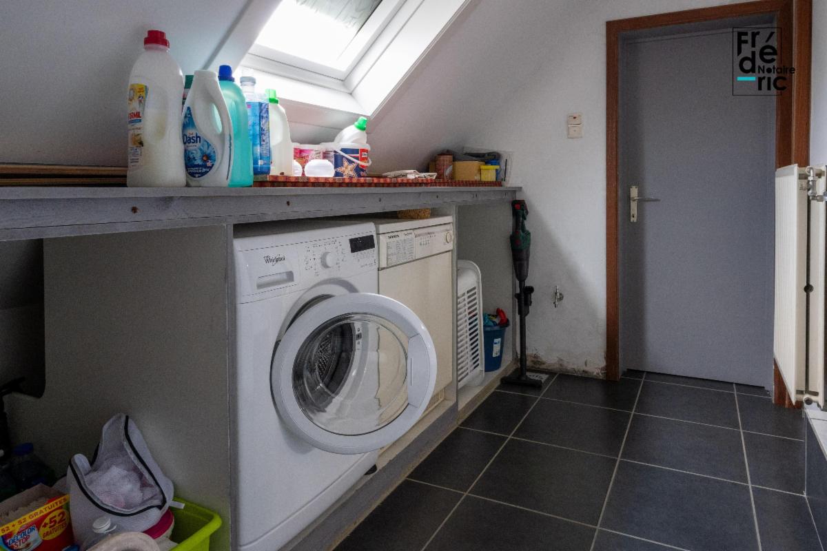 Le rez-de-chaussée se compose d'un grand salon lumineux côté route d'Ath, tandis qu'une salle à manger et une cuisine occupent le côté jardin. Le garage se trouve un demi niveau plus bas, dans le prolongement de la cuisine. Au premier étage, un hall de nuit ouvre sur deux grandes chambres et un bureau mansardé. Ce bureau était autrefois utilisé à destination de chambre. Dans le fond du hall de nuit, une buanderie se prolonge par la salle de douche. Une cave semi-enterrée se trouve sous une partie du salon.