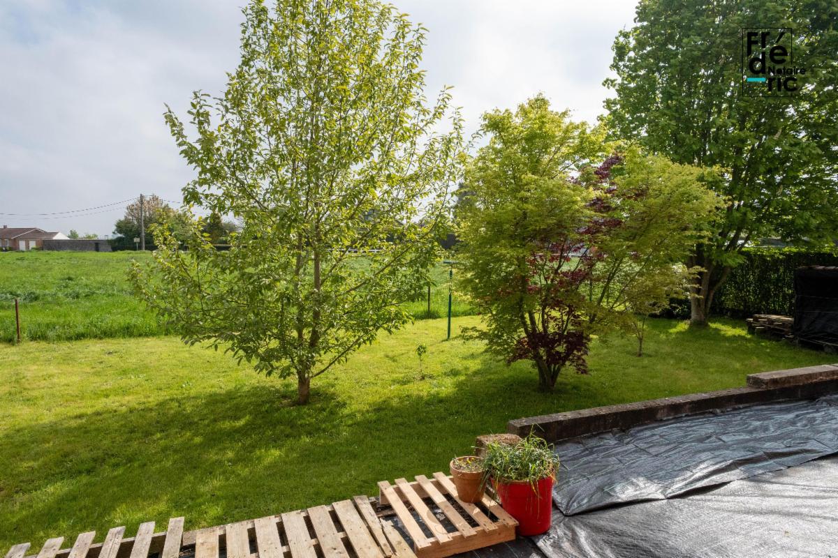 Devant la maison, une partie empierrée permet de garer plusieurs voitures, tandis qu'un petit jardin arboré occupe les côtés et l'arrière du terrain.