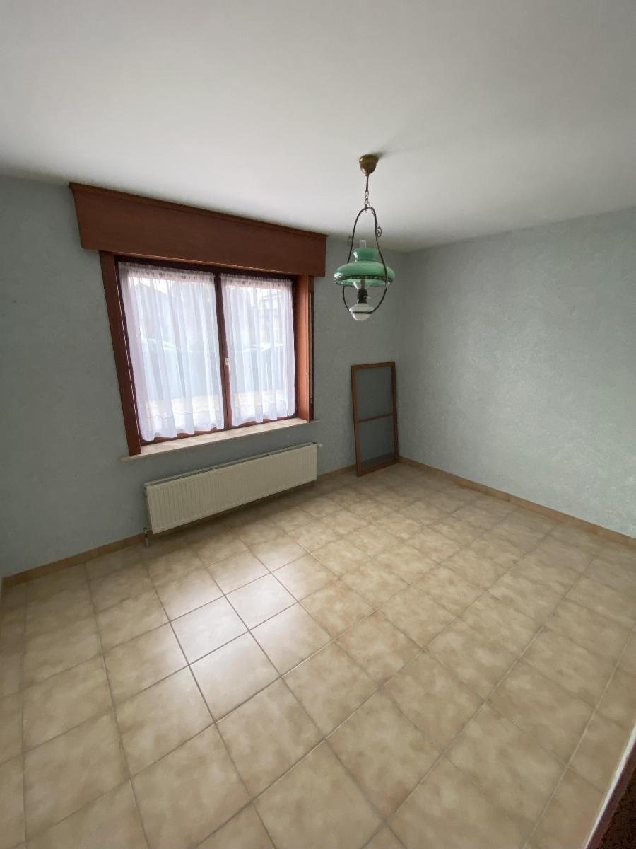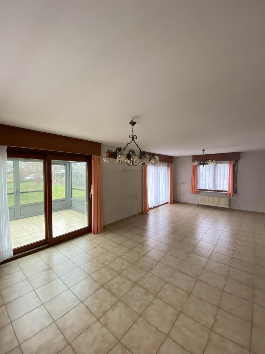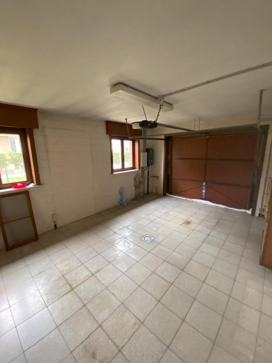 Au rez-de-chaussée : un hall d'entrée avec placards muraux et WC séparé, un bureau, une cuisine semi-équipée, un séjour lumineux, avec coin salon et salle-à-manger, une véranda (neuve), un hall de nuit qui mène vers 2 chambres, une salle d'eau avec un bain, un bidet, un évier et un WC, un garage (pour une voiture - avec porte électrique)