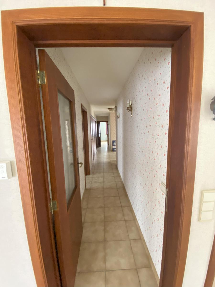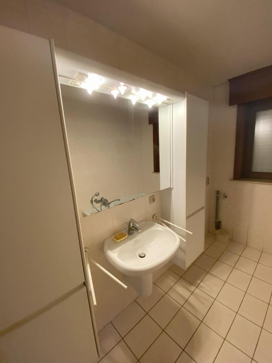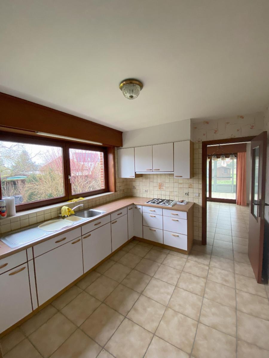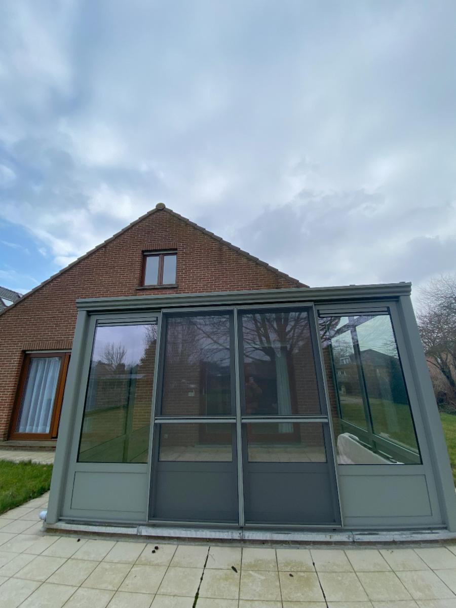 Au rez-de-chaussée : un hall d'entrée avec placards muraux et WC séparé, un bureau, une cuisine semi-équipée, un séjour lumineux, avec coin salon et salle-à-manger, une véranda (neuve), un hall de nuit qui mène vers 2 chambres, une salle d'eau avec un bain, un bidet, un évier et un WC, un garage (pour une voiture - avec porte électrique)
