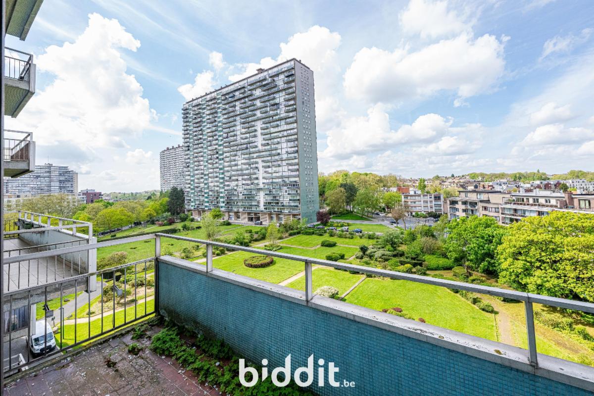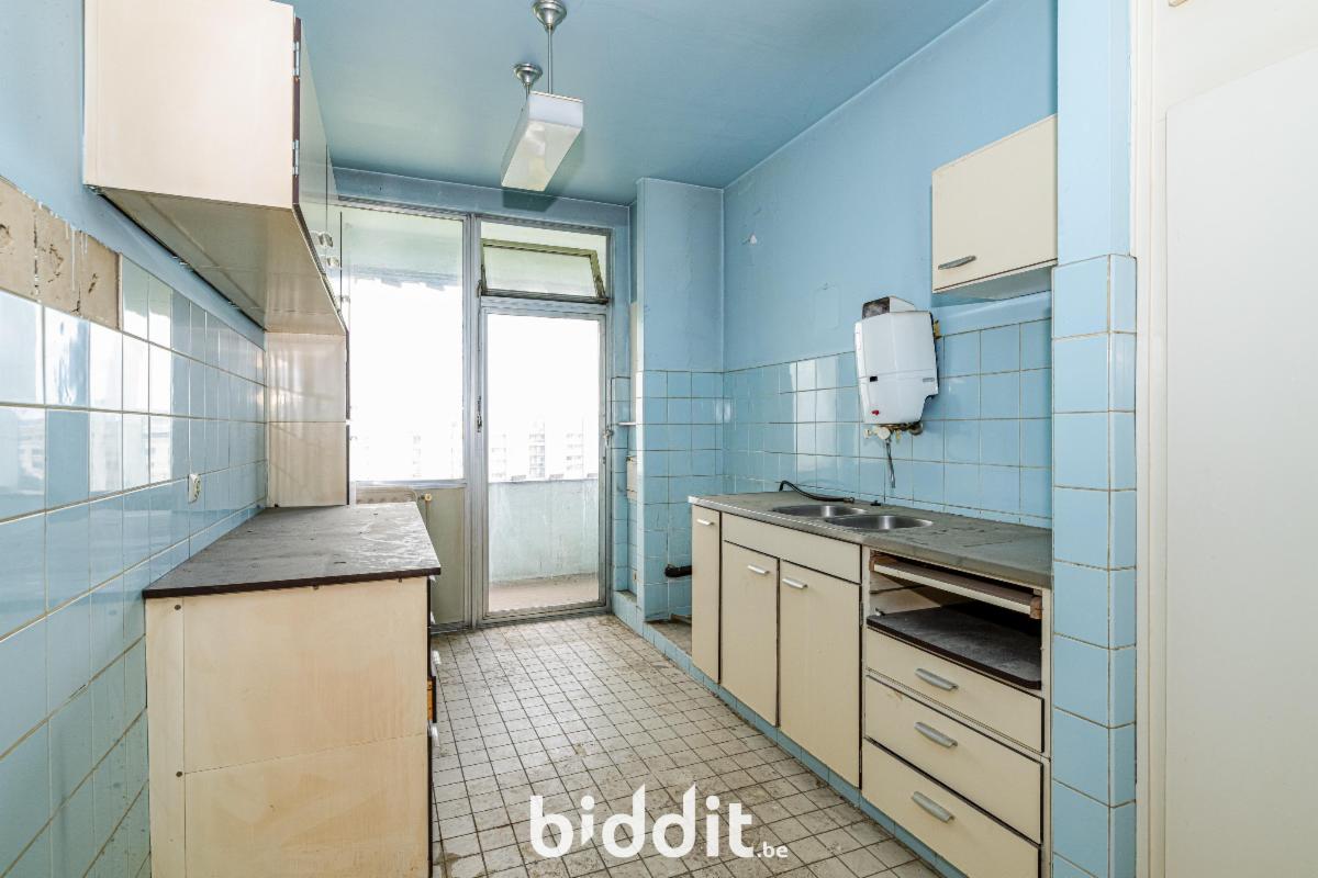 Comprenant hall, living avec balcon, cuisine avec terrasse, 2 chambres à coucher avec balcon, dégagement, salle de bains, wc, cave n° 37, chambre située dans la superstructure au 26e étage (CH19). R.c.n.i. 1.358€. PEB E/233. Contr. électr. non conforme.