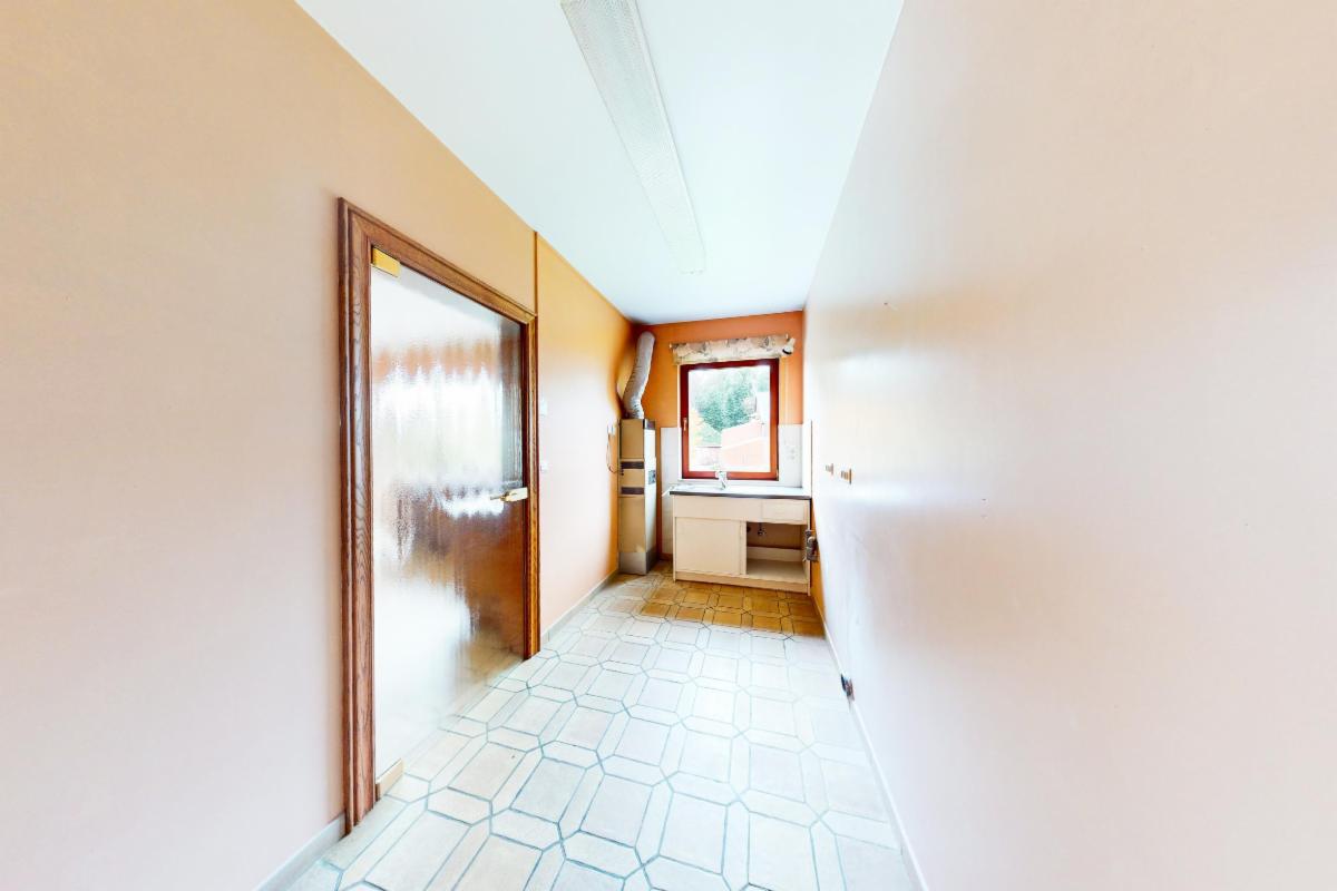 Au rez-de-chaussée : hall d'entrée avec WC et vestiaire, desservant d'un côté le salon/salle à manger, la grande cuisine; et continuant vers une pièce à usage de bureau/chambre, la salle de bain et le grand garage