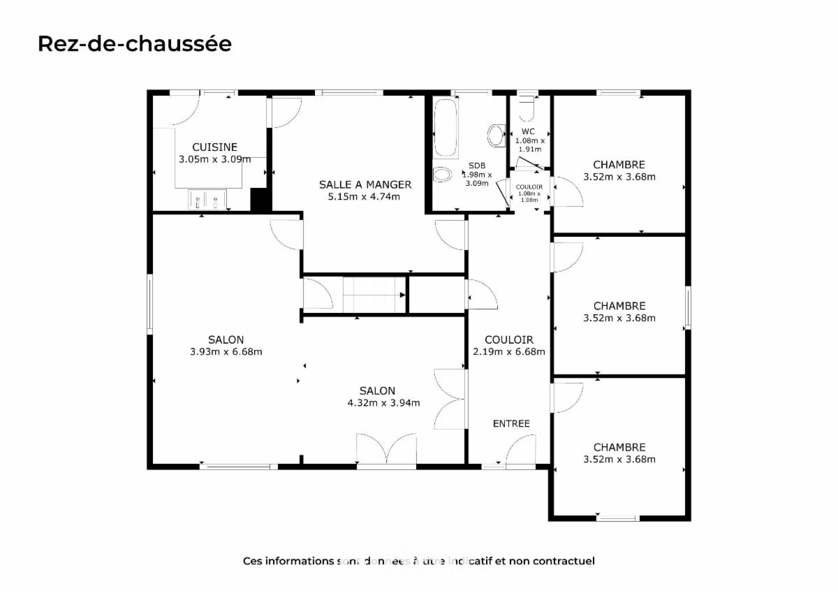 - Au rez-de-chaussée : hall d’entrée, grand salon en L avec feu ouvert (43m²) et poêle à pellet, salle à manger (24m²), cuisine en chêne semi-équipée (double évier, lave-vaisselle, four, hotte ), salle de bains (baignoire, évier, bidet), WC séparé, 3 chambres de chacune 13m²