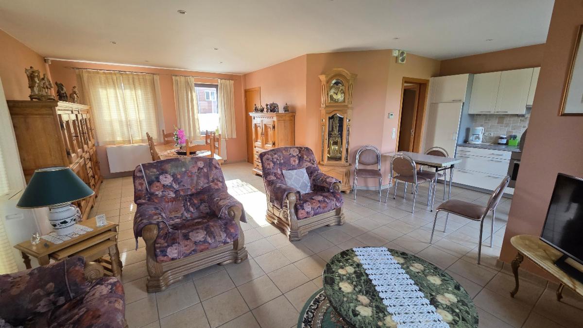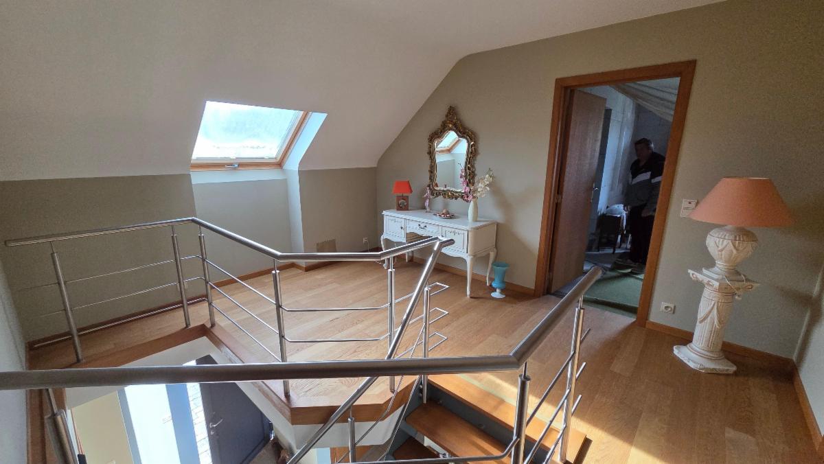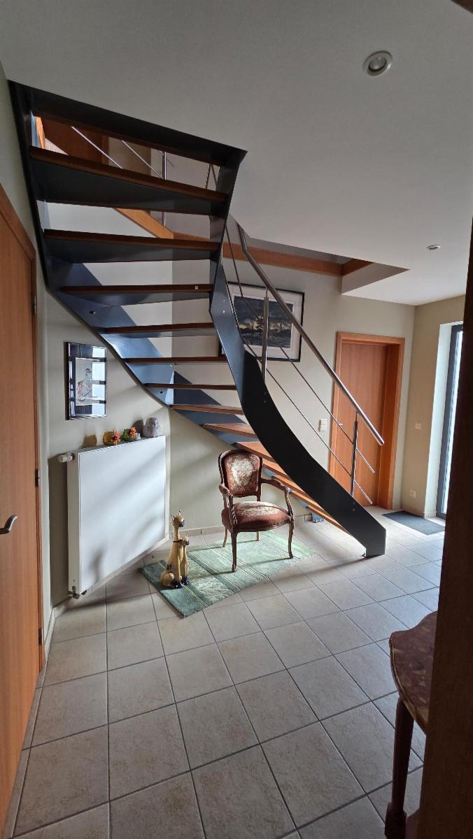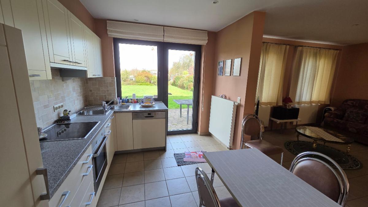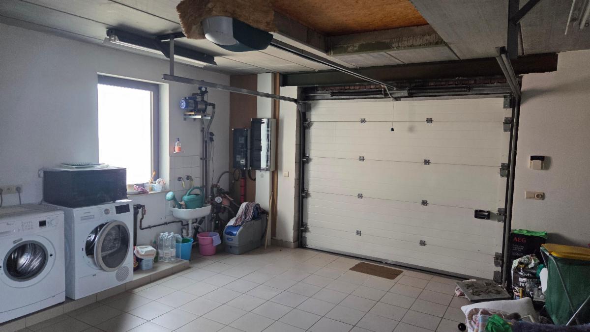 Hall d'entrée, wc, vestiaire, bel escalier vers l'étage aménageable en chambres (entrée en Y), Living +/- 29 m², chambre +/- 15 m², salle de douche avec wc +/- 8 m², cuisine équipée +/- 9 m², buanderie/chaufferie, garage avec porte électrique +/- 30 m².