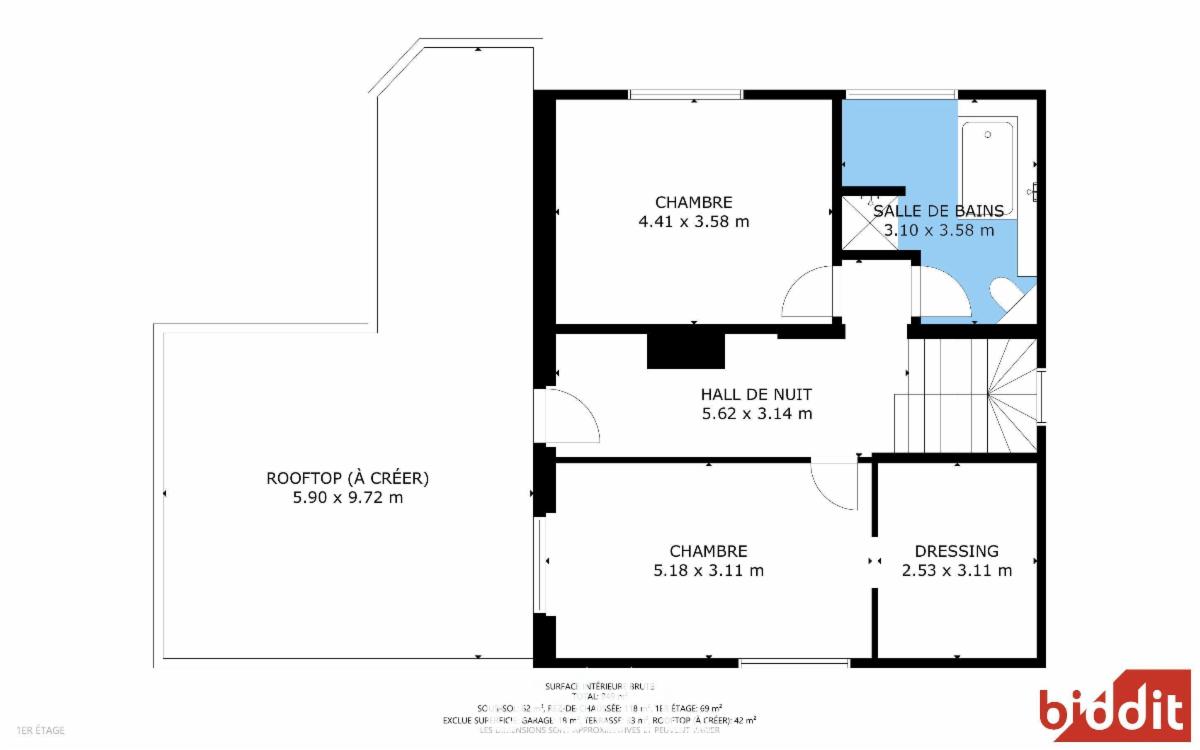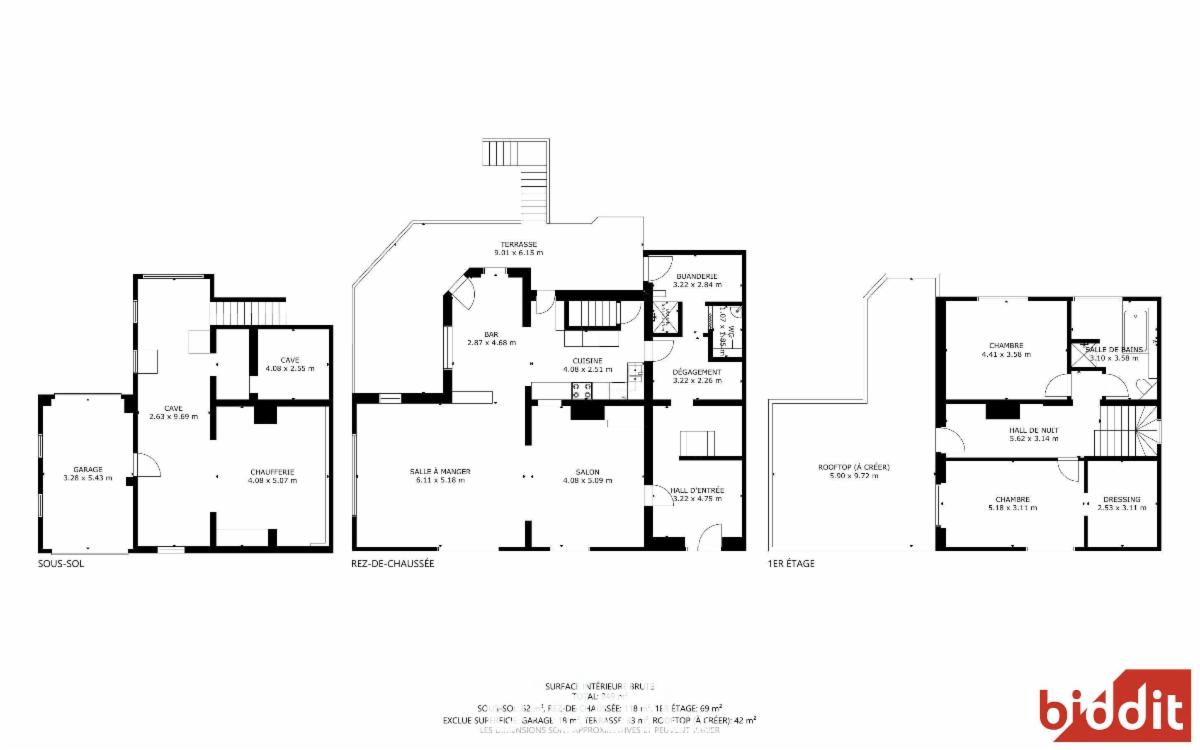 1er étage : un hall de nuit, deux chambres, une salle de bains et un dressing