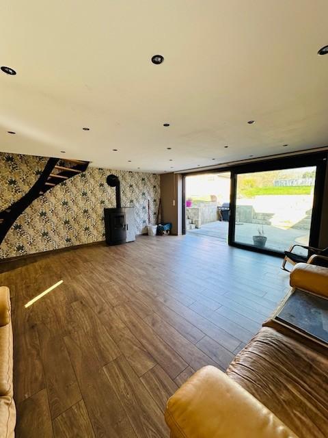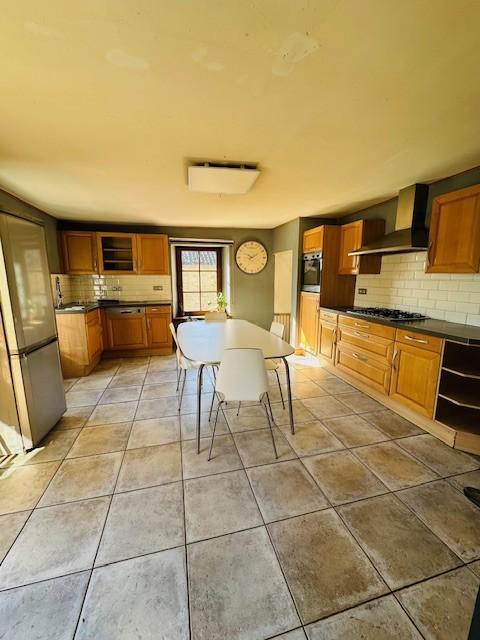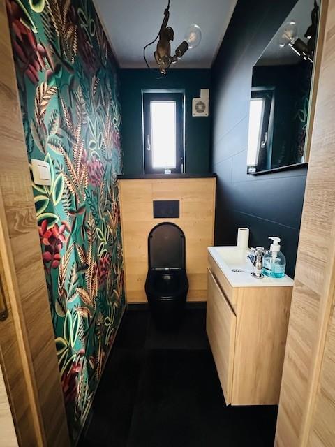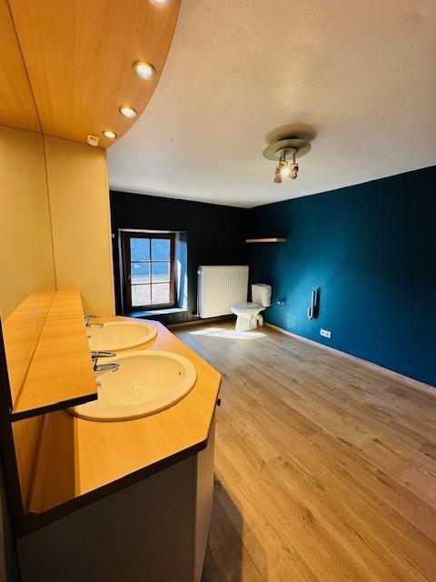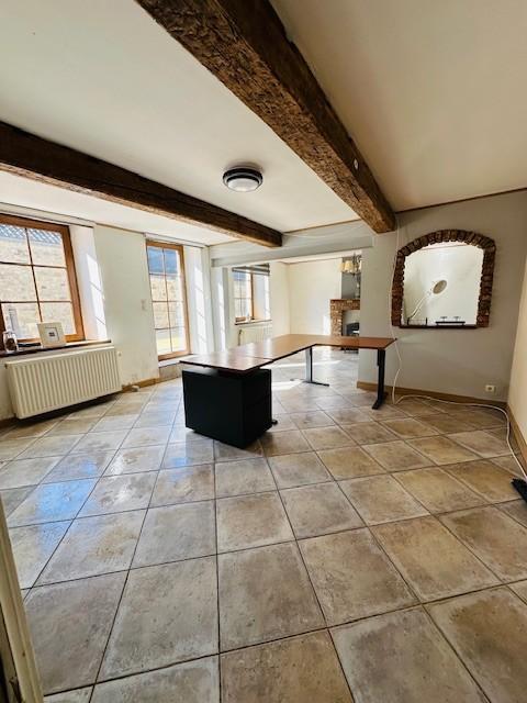 Elle se compose : Au rez-de-chaussée : un hall , un wc, un grand salon avec poêle a pellet/bois, cuisine équipée (four, taque gaz, lave-vaisselle et hotte), grande pièce pour profession libérale avec accès indépendant.