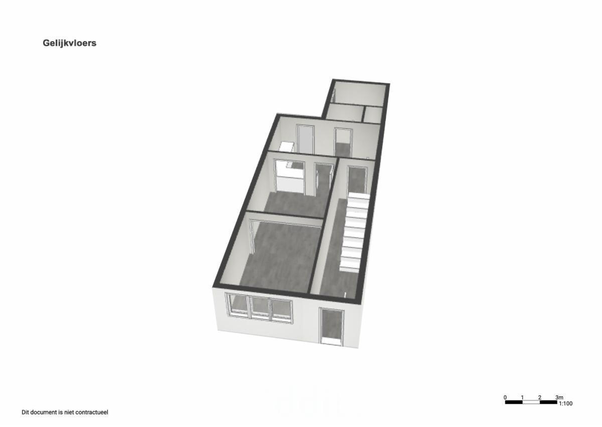 Rez-de-chaussée : hall d'entrée, salon, cuisine, salle de bain et toilette, jardin.