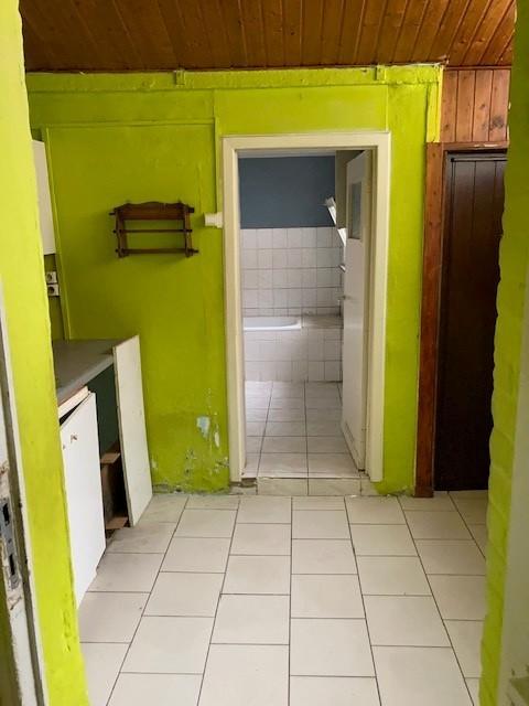 Une maison comprenant: un hall d'entrée, un salon, une salle à manger, une cuisine non équipée, une salle de bains, 3 chambres, un grenier, une cave et une cave à charbon. Chauffage : poêle au mazout.