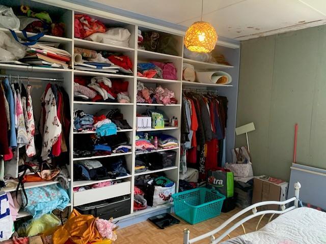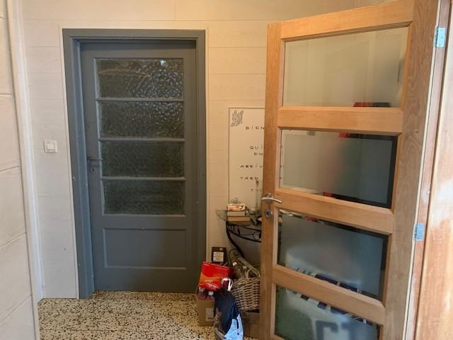 Hall d'entrée avec WC, salle de bains à rénover, salon et salle à manger ouvert sur la cuisine équipée (four, lave-vaisselle, plaque vitrocéramique), deux chambres, un bureau , garage,