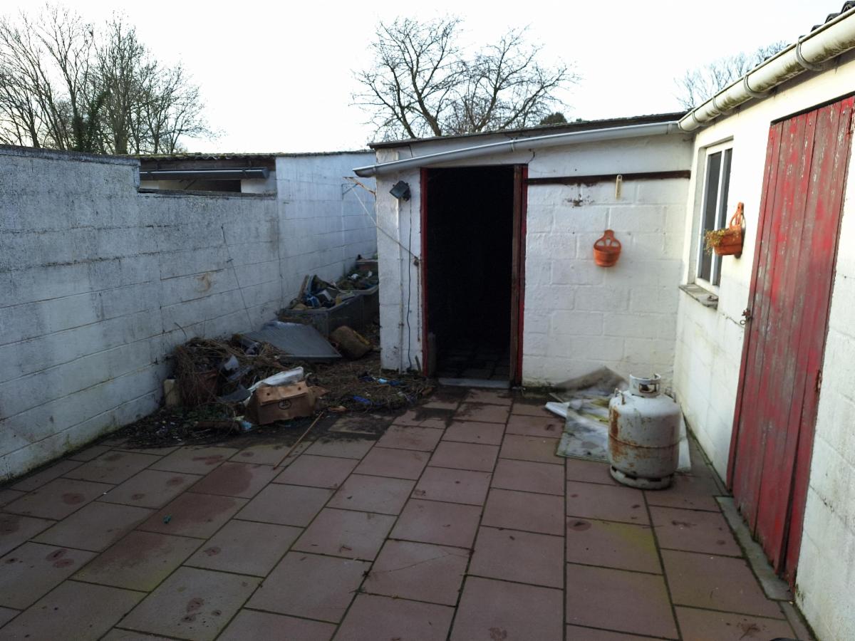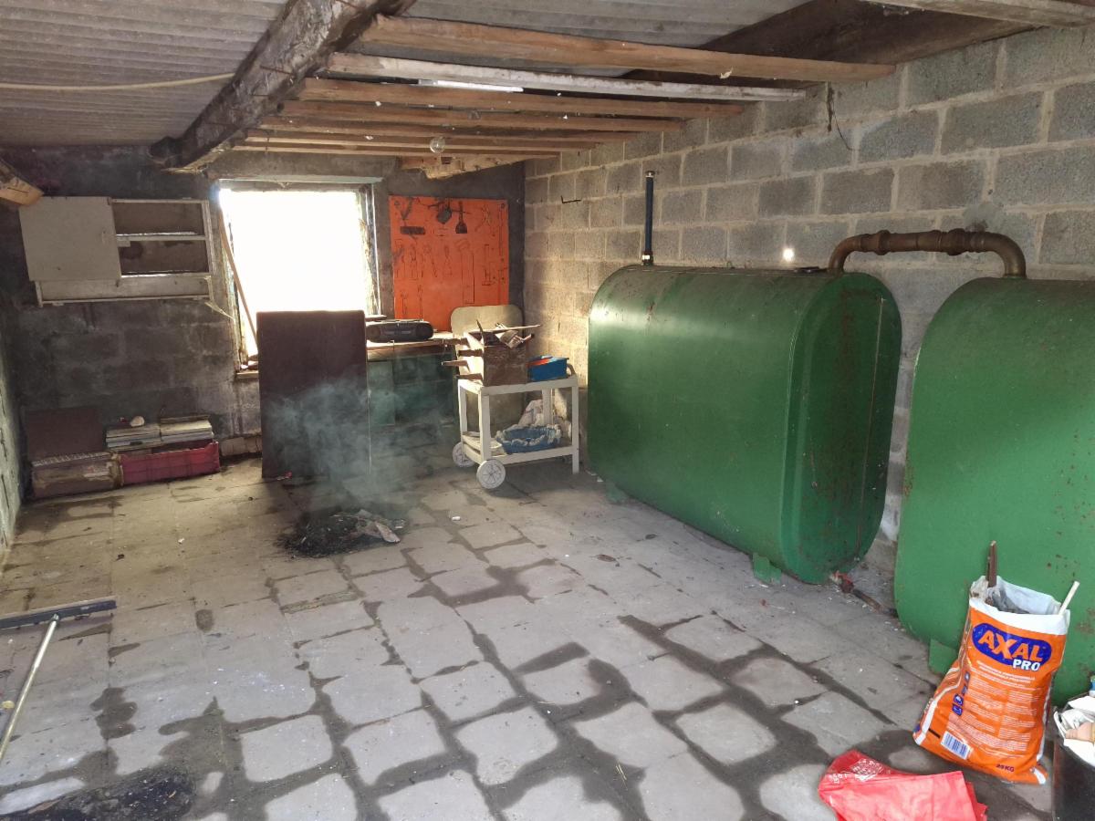 Extérieur : cour/terrasse ; atelier/remises contenant la chaudière (qui n’est plus fonctionnelle) et citernes à mazout (aériennes). Grand jardin en longueur