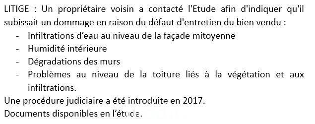 ATTENTION : Un propriétaire voisin a contacté l'Etude afin d'indiquer qu'il subissait un dommage en raison du défaut d'entretien du bien vendu : Infiltrations d’eau au niveau de la façade mitoyenne - Humidité intérieure - Dégradations des murs - Problèmes au niveau de la toiture liés à la végétation et aux infiltrations. Une procédure judiciaire a été introduite en 2017.