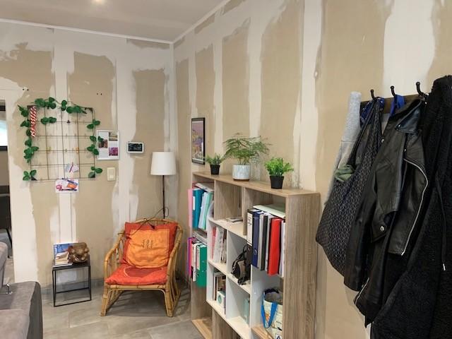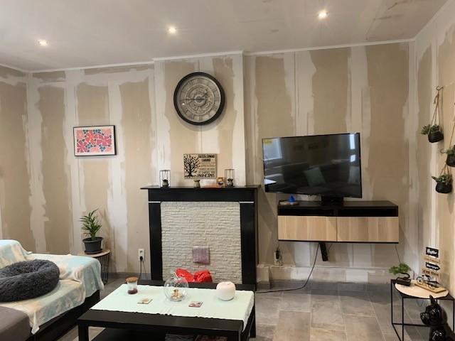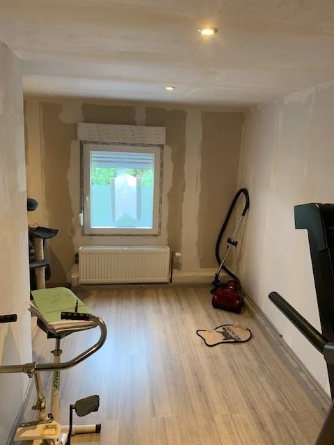 Rez-de-chaussée : Un grand salon lumineux, dont les murs en plaques de gyproc sont prêts à être enduits et peints