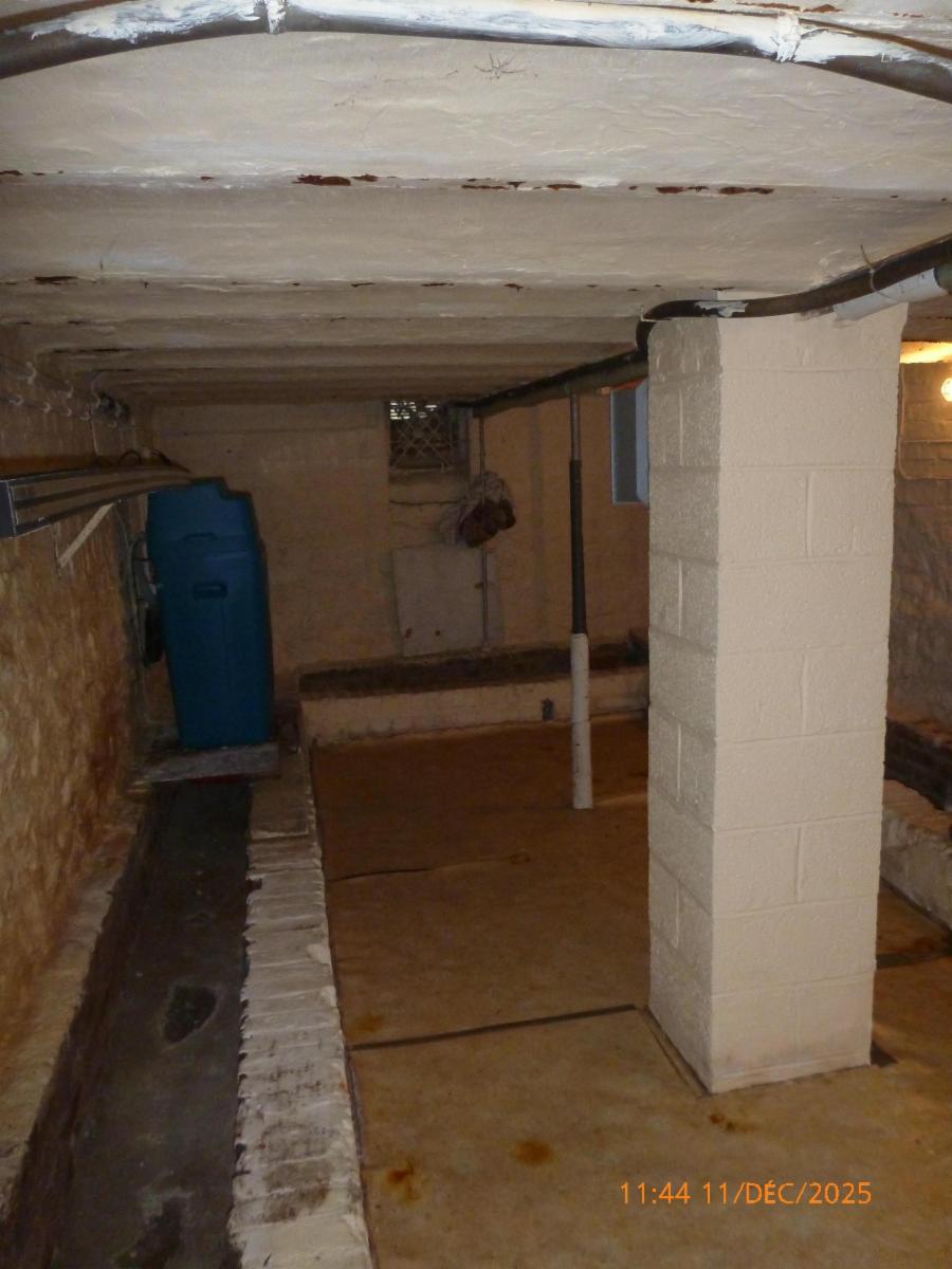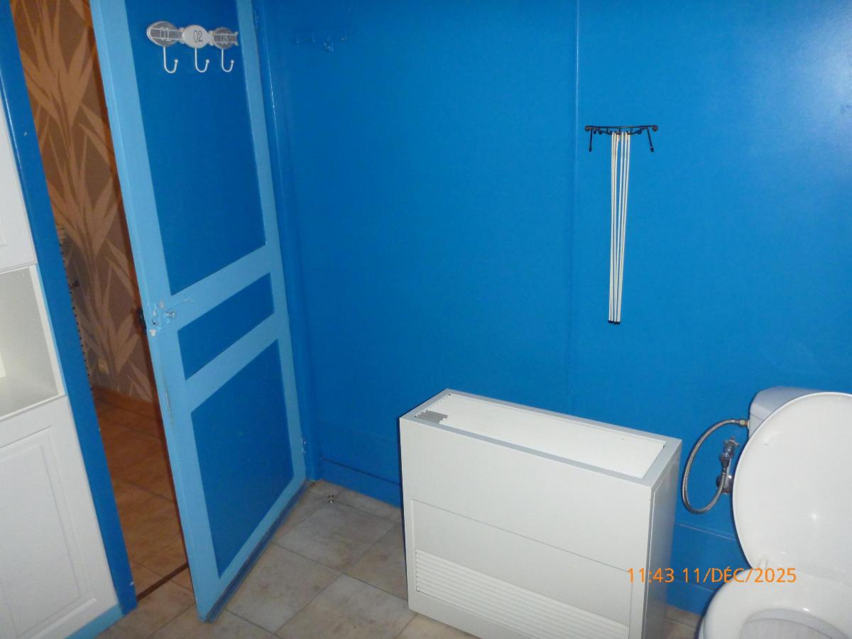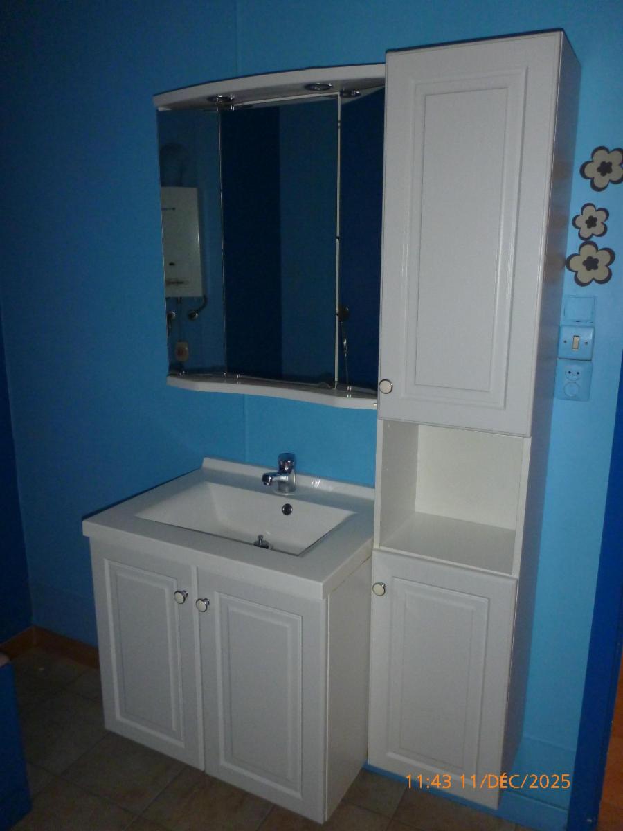 - Rez : une salle à manger, 1 chambre, une salle de bain (WC, baignoire, évier), une cuisine (évier, four, taque au gaz, frigo et congélateur).