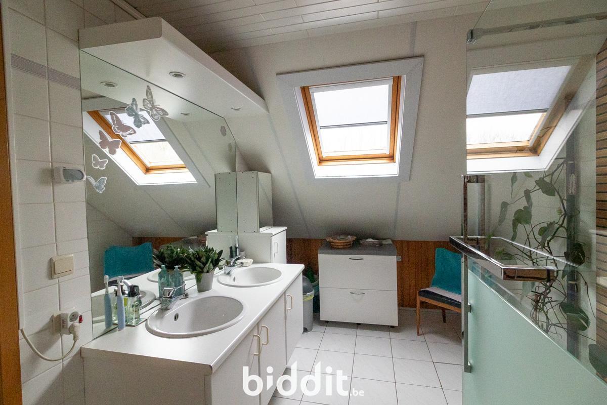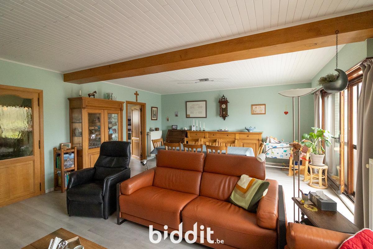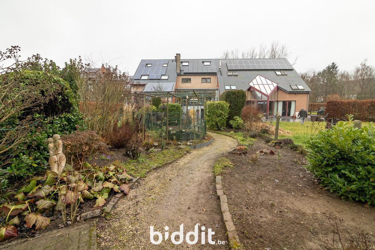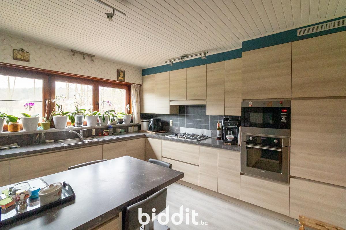 Au premier étage, on trouve à nouveau un hall d'entrée avec toilettes. De là, on accède à la cuisine et au salon avec véranda attenante. La terrasse et le jardin sont également accessibles depuis cette véranda.