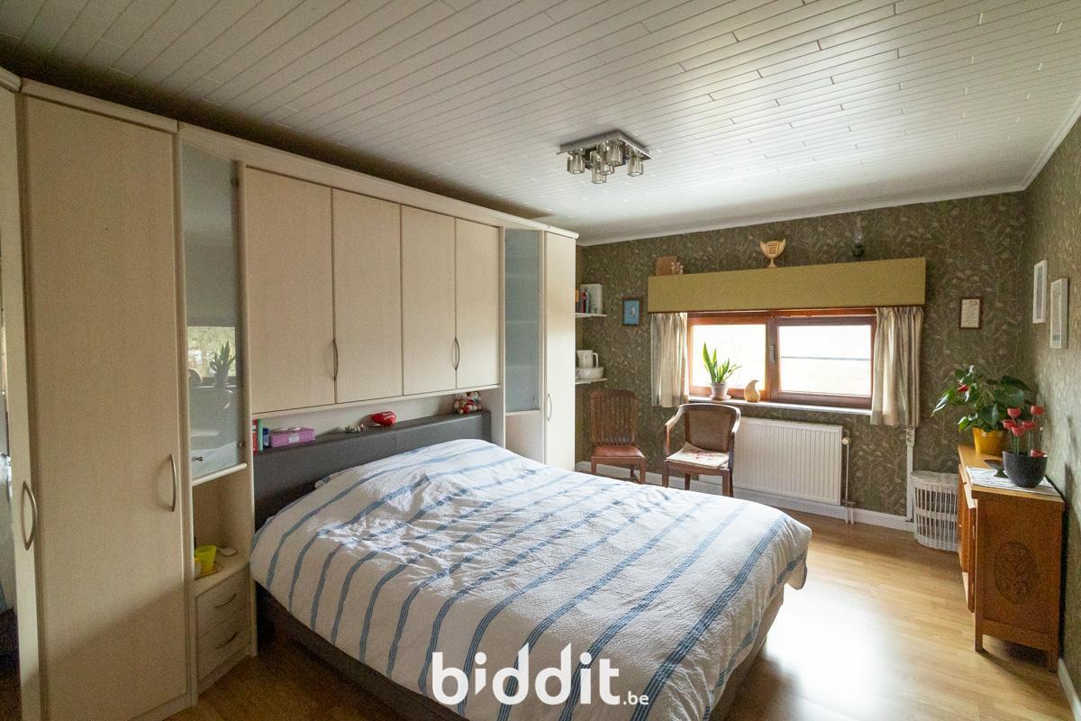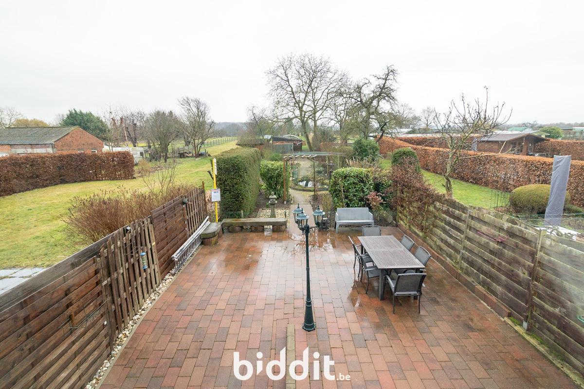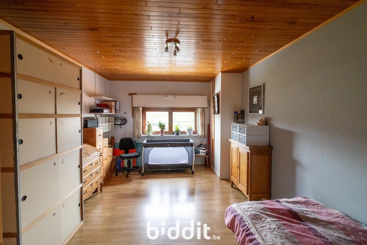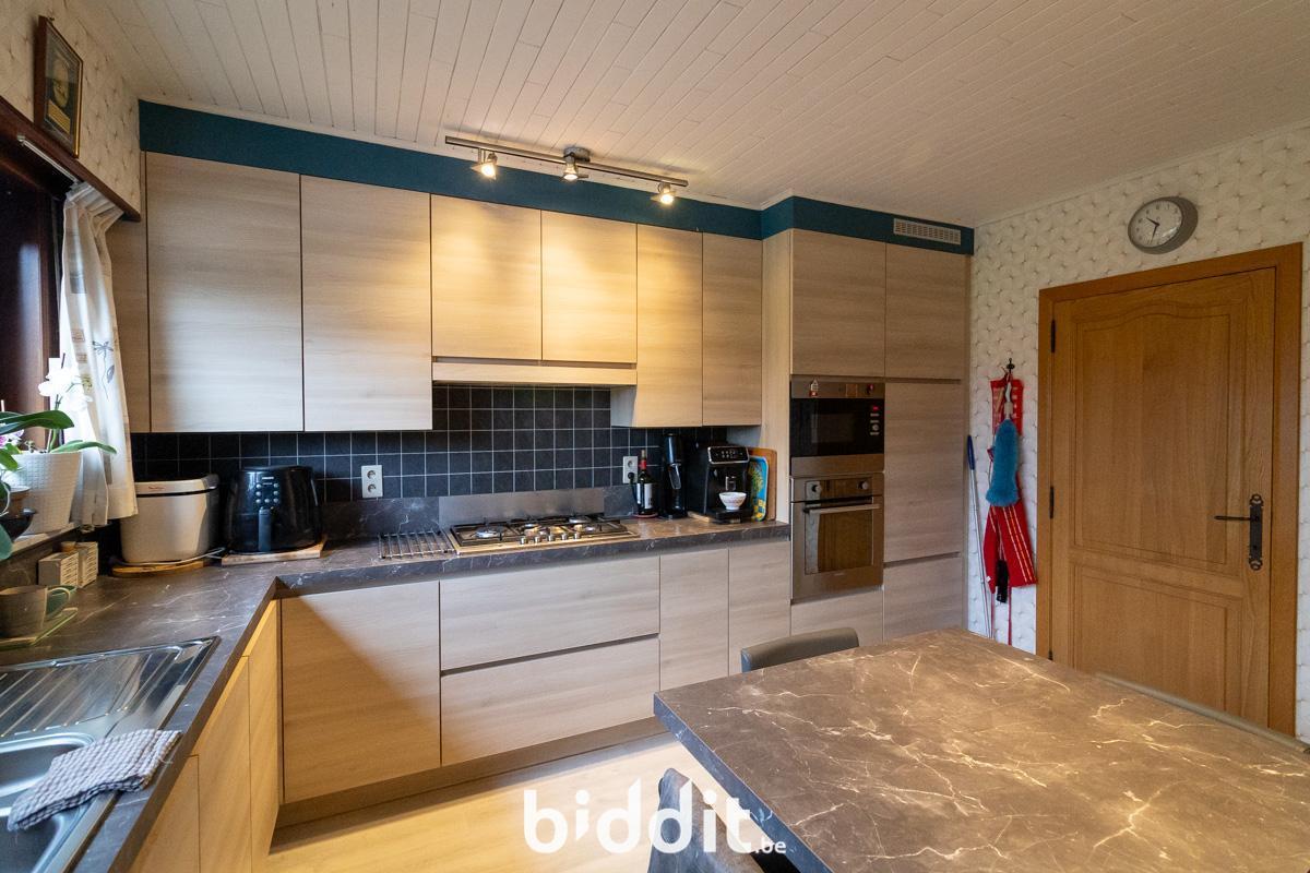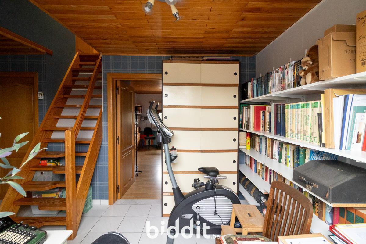 Au premier étage, on trouve à nouveau un hall d'entrée avec toilettes. De là, on accède à la cuisine et au salon avec véranda attenante. La terrasse et le jardin sont également accessibles depuis cette véranda.