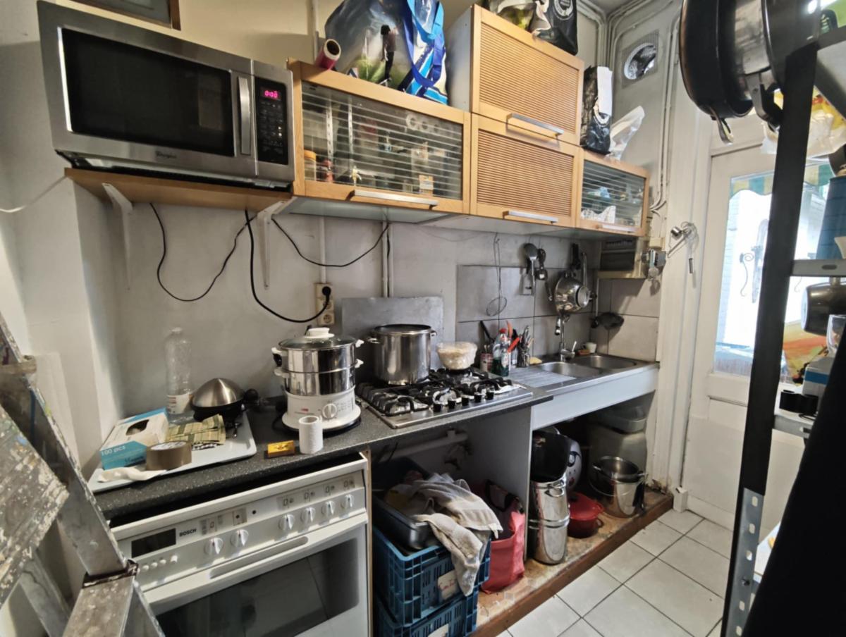 Rez-de-chaussée : salle de café avec comptoir, living avec coin cuisine (équipée au gaz), un WC