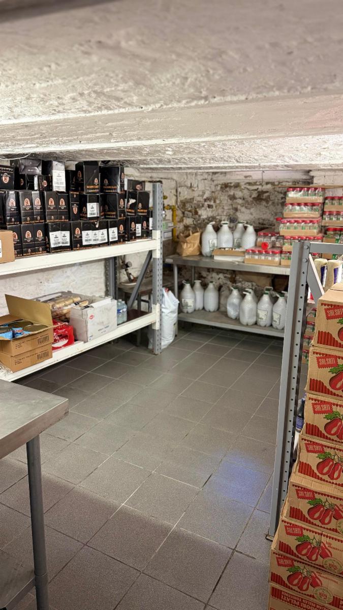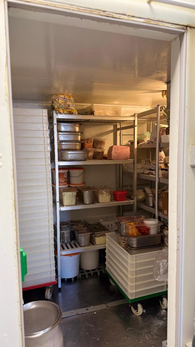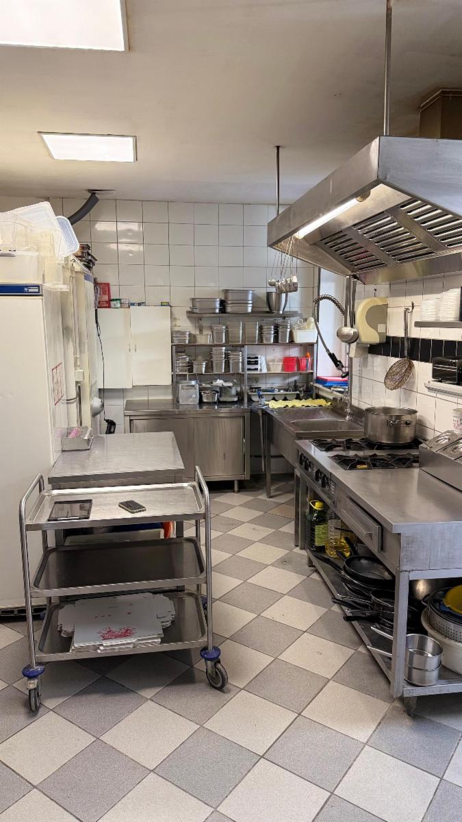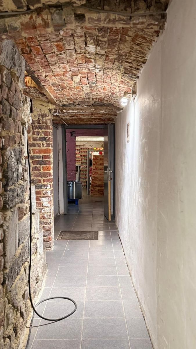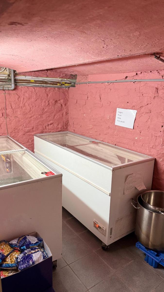 Au rez-de-chaussée : un espace comptoir et une cuisine à l’arrière entièrement équipée avec chambre froide, prête à l’exploitation.