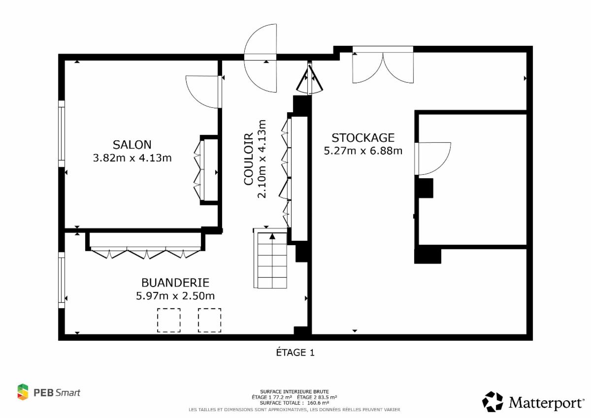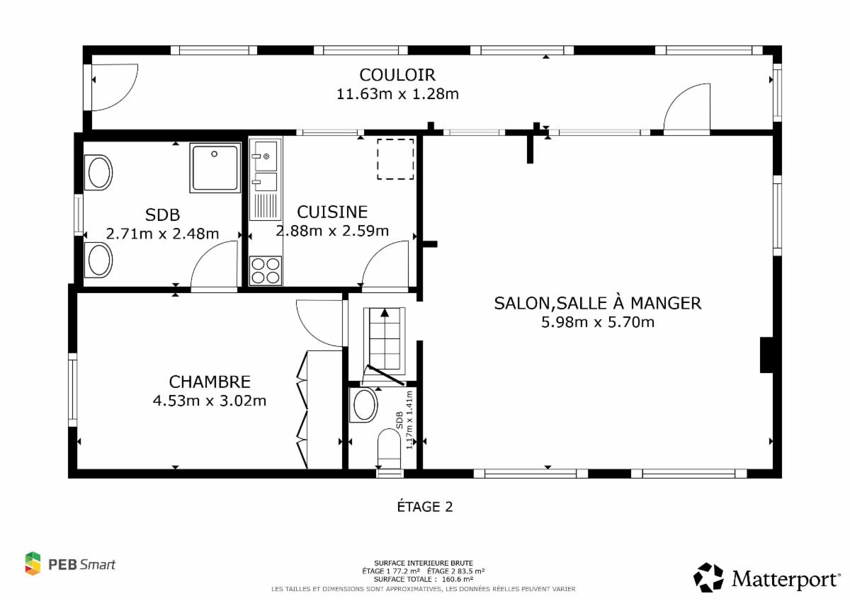 Niveau 1: Hall d’entrée, salon-salle à manger avec feu ouvert, cuisine, chambre, une salle de