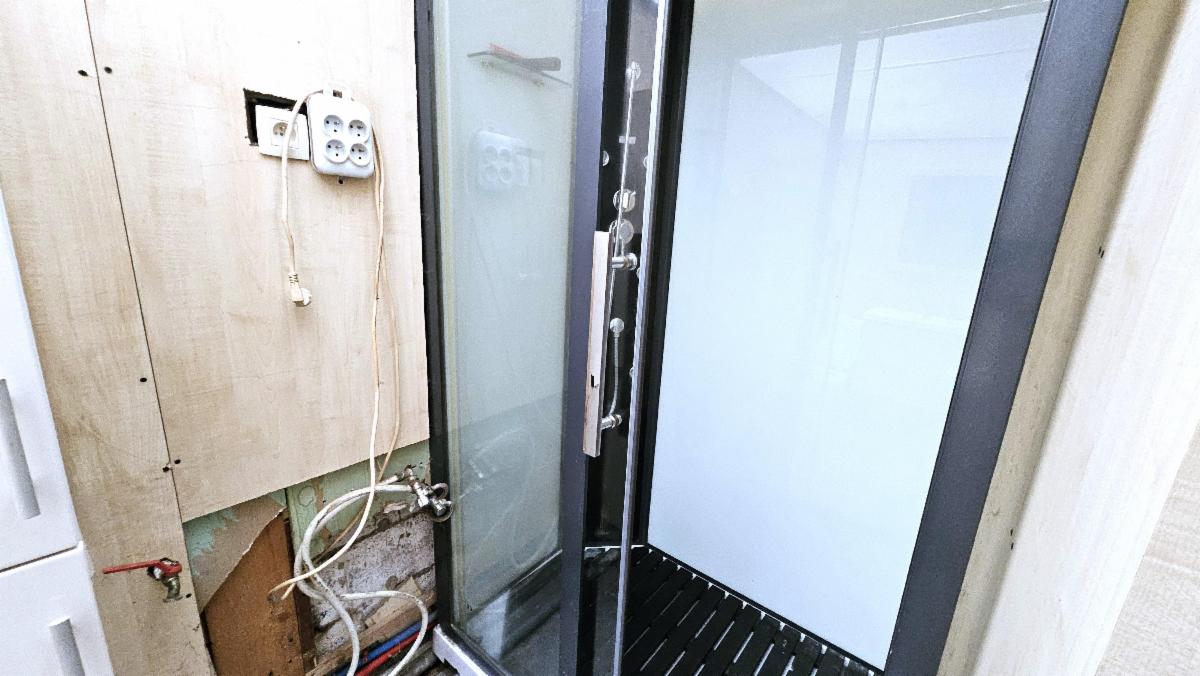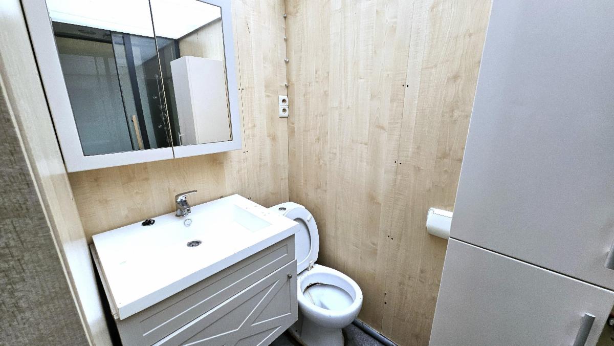 *Rez-de-chaussée : petit jardin avant (sol en béton et gazon synthétique) avec clôture faisant office d’entrée sur le terrain, chalet de jardin et kotch sur le côté. Porte d’entrée en bois avec deux fenêtres en bois sur l’avant. Pièce de vie avec feu au bois donnant accès, sur la gauche, à une buanderie/salle de bain avec WC et douche. Sur la droite, une petite cuisine équipée d’une taque au gaz, d’un four et d’une hotte. L’escalier apparent dans la pièce de vie mène au 1er étage.