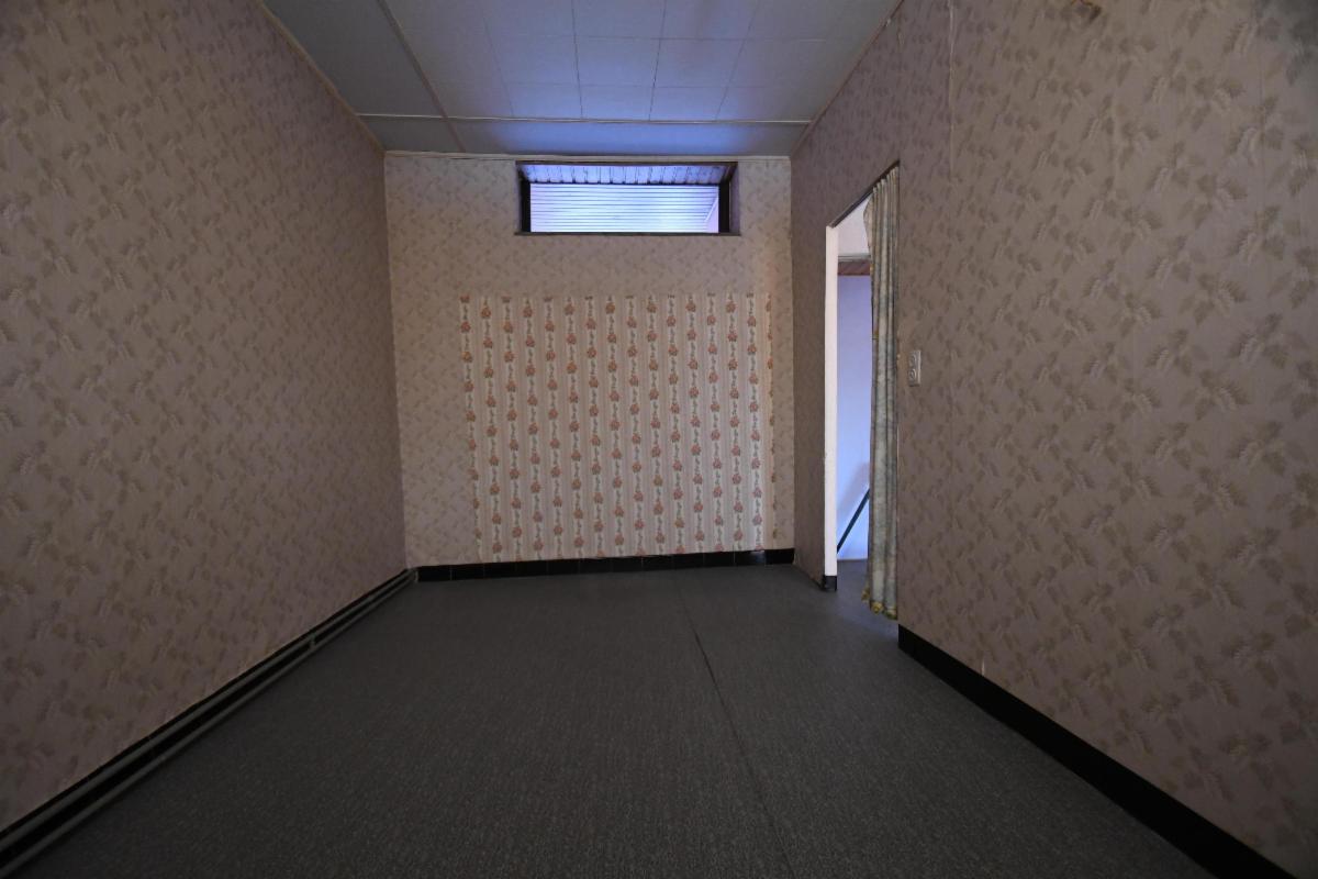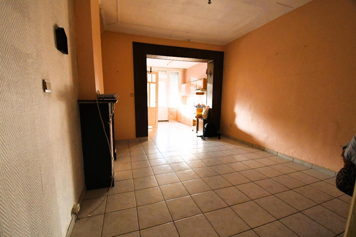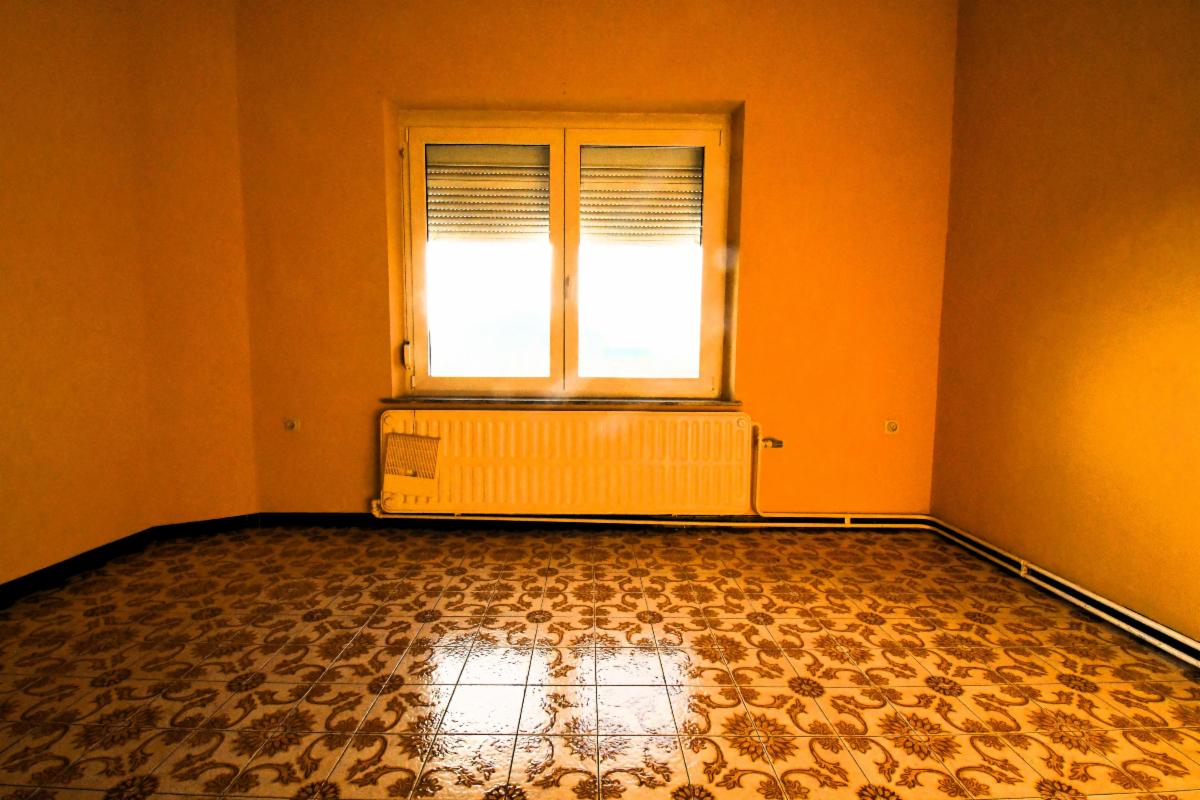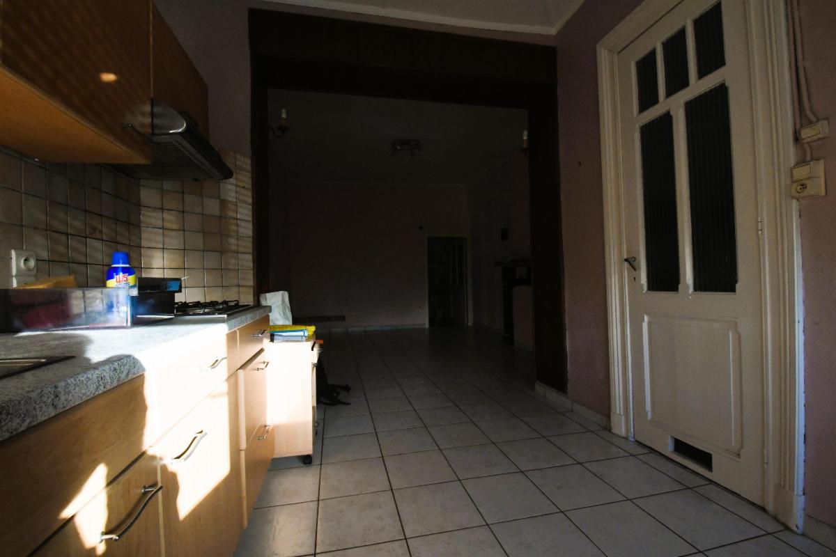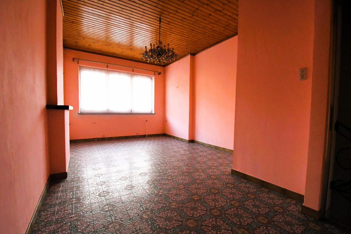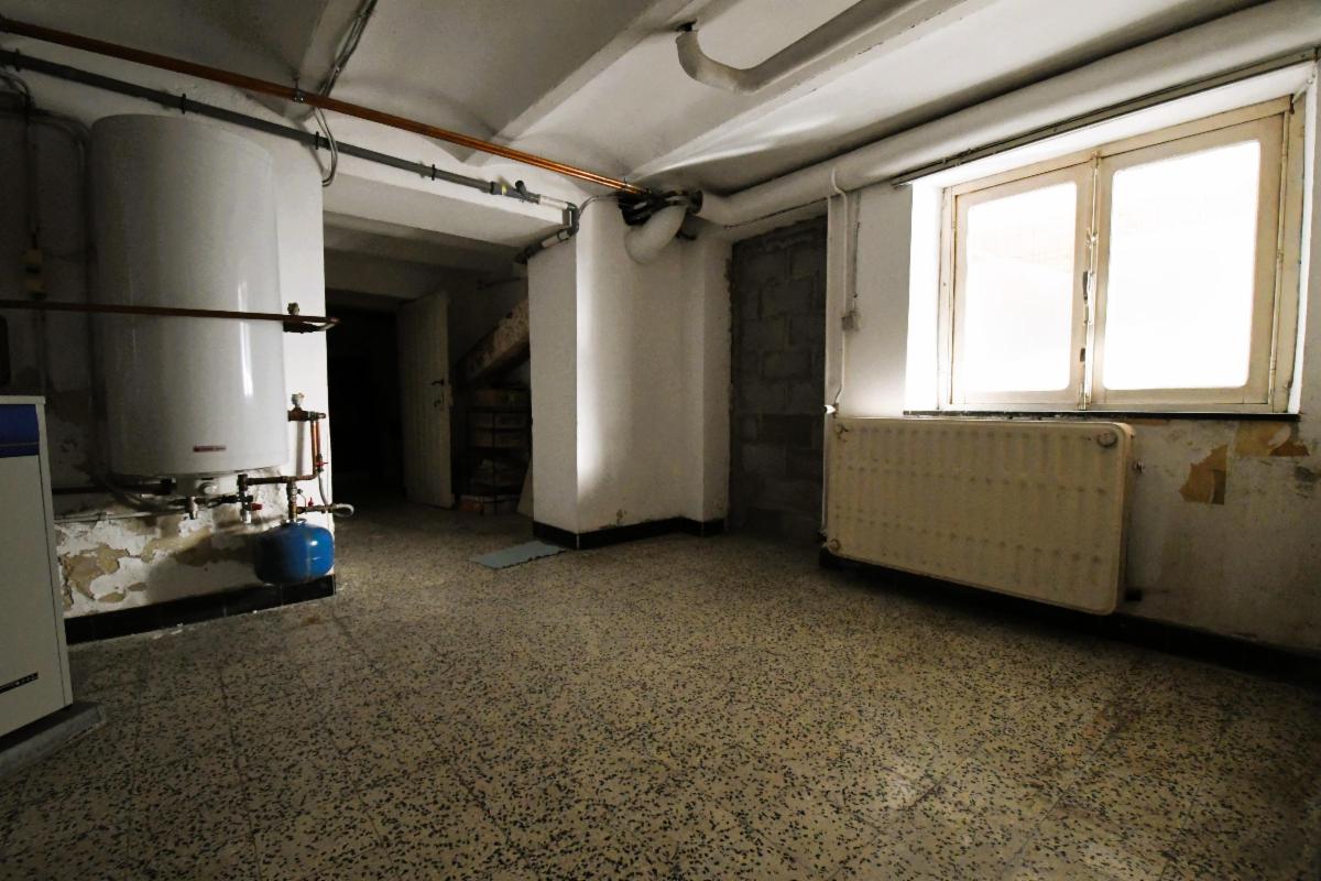 Maison d'habitation avec garage et jardin comprenant au rez-de-chaussée, un grand garage avec fosse et cage d'escalier, une pièce de séjour avec cuisine, une salle de bains (douche, évier et wc), une grande terrasse arrière avec escalier vers le jardin; au 1er étage: deux grandes chambres et une pièce à usage de bureau/rangement. Caves sous tout l'immeuble avec chaudière gaz et boiler. Châssis PVC double vitrage, sauf un en métal avec double vitrage et un en bois.