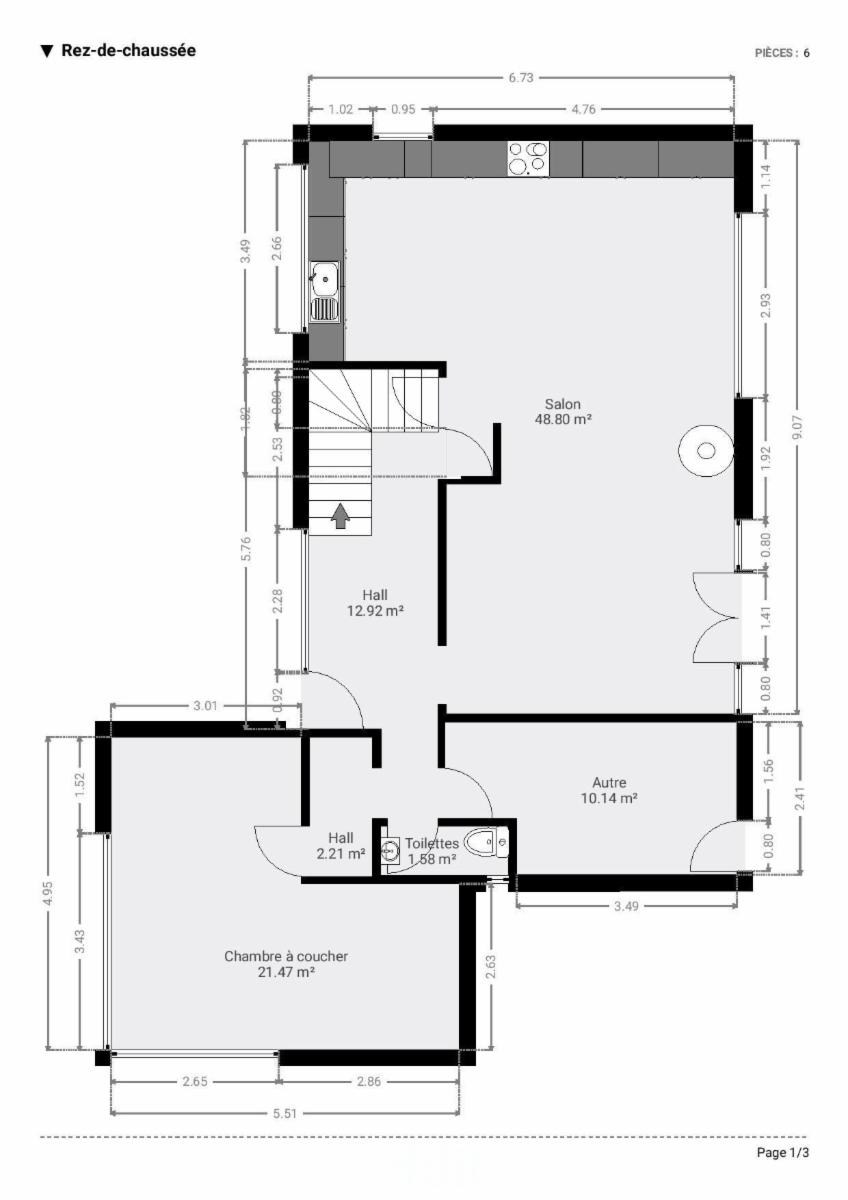 Au rez : Hall d’entrée (12,92 m²), cuisine équipée ouverte sur le salon (48,80m²), pièce 1 (10,14 m²), pièce 2 (21,47m²), toilettes (1,58m²).