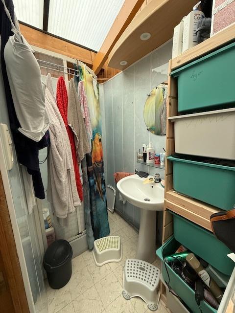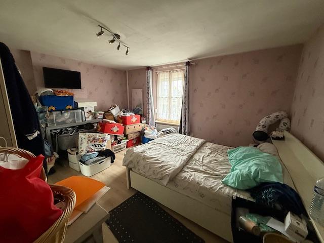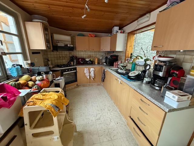 - au-rez-de-chaussée: pièce à l'avant, living (feu au mazout), salle-de-bain (douche, évier), cuisine (taque au gaz, four électrique, hotte, double évier), buanderie, wc;